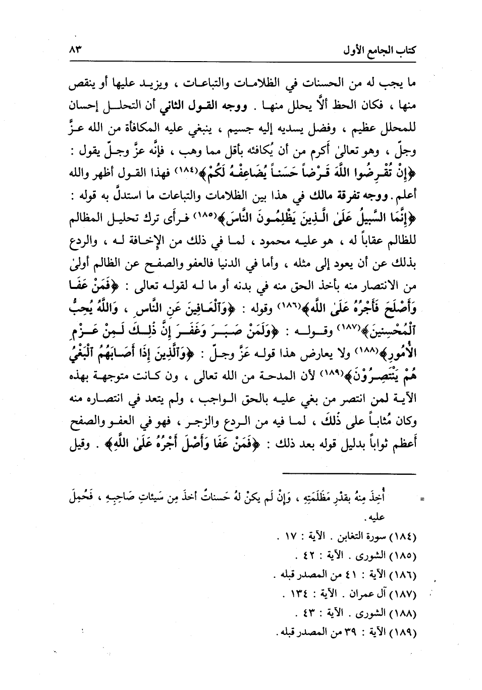 ووجه تفرقة مالك في هذا بين الظلامات والتباعات ما استدلَّ به قوله: {إِنَّمَا السَّبِيلُ عَلَى الَّذِينَ يَظْلِمُونَ النَّاسَ} [الشورى: 42] فرأَى ترك تحليل المظالم للظالم عقاباً له، هو عليه محمود، لما في ذلك من الِإخافة له، والردع بذلك عن أن يعود إلى مثله، وأما في الدنيا فالعفو والصفح عن الظالم أولى من الانتصار منه بأخذ الحق منه في بدنه أو ما له لِقَوْلِهِ تَعَالَى: {فَمَنْ عَفَا وَأَصْلَحَ فَأَجْرُهُ عَلَى اللَّهِ} [الشورى: 40] وقوله: {وَالْعَافِينَ عَنِ النَّاسِ وَاللَّهُ يُحِبُّ الْمُحْسِنِينَ} [آل عمران: 134] وقوله: {وَلَمَنْ صَبَرَ وَغَفَرَ إِنَّ ذَلِكَ لَمِنْ عَزْمِ الأُمُورِ} [الشورى: 43] ولا يعارض هذا قوله عَزَّ وجلّ: {وَالَّذِينَ إِذَا أَصَابَهُمُ الْبَغْيُ هُمْ يَنْتَصِرُونَ} [الشورى: 39] ؛ لأن المدحة من الله تعالى، وإن كانت متوجهة بهذه الآية لمن انتصر من بغي عليه بالحق الواجب، ولم يتعد في انتصاره منه وكان مُثاباً على ذلكَ، لما فيه من الردع والزجر، فهو في العفو والصفح أَعظم ثواباً، بدليل قوله بعد ذلك: {فَمَنْ عَفَا وَأَصْلَحَ فَأَجْرُهُ عَلَى اللَّهِ} [الشورى: 40] . وقيل: