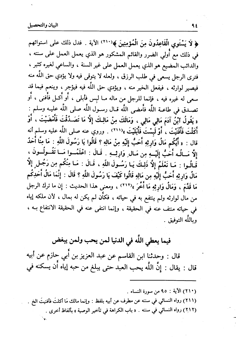 قال رسول اللَّه - صَلَّى اللَّهُ عَلَيْهِ وَسَلَّمَ -: «يَقُولُ ابْنُ آدَمَ: مَالِي مَالِي، وَمَا لَكَ مِنْ مَالِكَ إِلّاَ مَا تَصَدَّقْتَ فَأمْضَيْتَ، أوْ أكَلْتَ فَأفْنَيْتَ، أوْ لَبِسْتَ فَأبْلَيْتَ» . وروي عنه - صَلَّى اللَّهُ عَلَيْهِ وَسَلَّمَ - أنه قال: «أيُّكُم مَالُ وَارِثِهِ أحَبُّ إِلَيْهِ مِنْ ماله؟ " قَالُوا: يَا رَسُولَ اللَّهِ، مَا مِنّا أَحَدٌ إِلَّا ماله أحَبُّ إِلَيْهِ مِن مَال وَارِثِهِ. قَالَ: "اعْلَمُوا مَا تَقُولُونَ؟ " قَالُوا: مَا نَعْلَمُ إِلَّا ذَلِكَ يَا رَسُولَ اللهِ، قَالَ: "مَا مِنْكُم مِن رَجُلٍ إِلّاَ مَالُ وَارِثِهِ أحَبُّ إِلَيْهِ مِن ماله"، قَالًوا: كَيْفَ يَا رَسُولَ اللَّهِ؟ قَالَ: "إِنَّمَا مَالُ أحَدِكُم ما قدًّمَ، وَمَالُ وَارِثِهِ مَا أخَّرَ» ، ومعنى هذا الحديث: إِن ما ترك الرجل من مال لوارثه ولم ينتفع به في حياته، فكأن لم يكن له بمال؛ لأن ملكه إياه في حياته منتف عنه في الحقيقة، وإنما انتفى عنه في الحقيقة الانتفاع به، وباللَّه التوفيق.