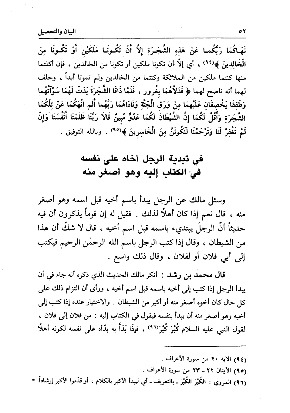 قال محمد بن رشد: أنكر مالك الحديث الذي ذكره أنه جاء في أن يبدأ الرجل إذا كتب إلى أخيه باسمه قبل اسم أخيه، ورأى أن التزام ذلك على كل حال كان أخوه أصغر منه أو أكبر من الشيطان. والاختيار عنده إذا كتب إلى أخيه وهو أصغر منه أن يبدأ بنفسه فيقول في الكتاب إليه: من فلان إلى فلان، لقول النبي - عَلَيْهِ السَّلَامُ - «كبر كبر» فإذا بدأ به بدأه على نفسه لكونه أهلا