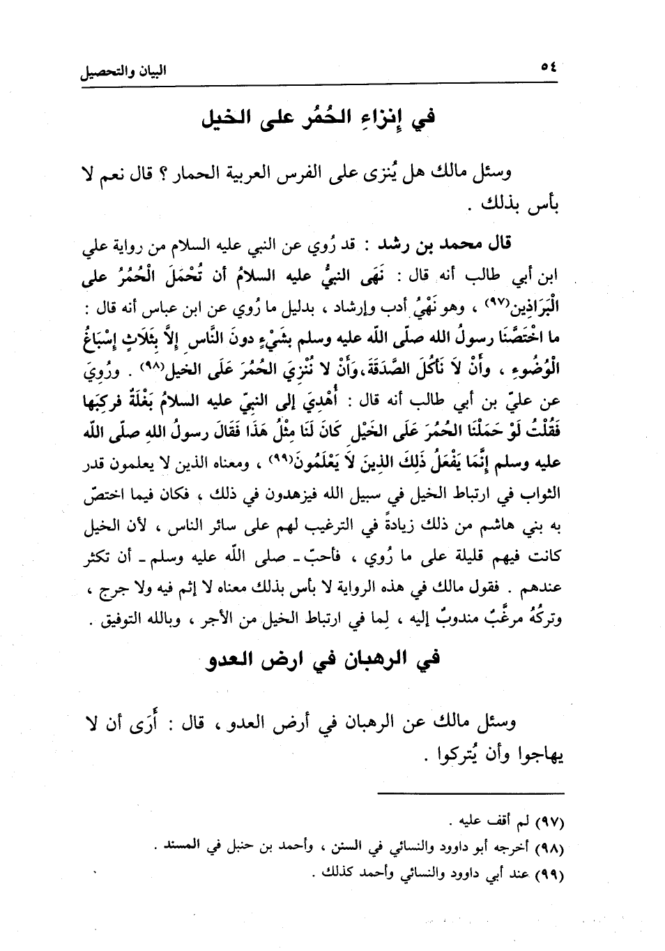قال محمد بن رشد: قد روي عن النبي - عَلَيْهِ السَّلَامُ - من رواية علي بن أبي طالب أنه قال: «نهى النبي - عَلَيْهِ السَّلَامُ - أن تحمل الحمر على البراذين» وهو نهي أدب وإرشاد، بدليل ما روي «عن ابن عباس أنه قال: ما اختصنا رسول الله - صَلَّى اللَّهُ عَلَيْهِ وَسَلَّمَ - بشيء دون الناس إلا بثلاث: إسباغ الوضوء، وأن لا نأكل الصدقة، وأن لا ننزي الحمر على الخيل» . وروي «عن علي بن أبي طالب أنه قال: أهدي إلى النبي - عَلَيْهِ السَّلَامُ - بغلة فركبها فقلت: لو حملنا الحمر على الخيل كان لنا مثل هذا فقال رسول الله - صَلَّى اللَّهُ عَلَيْهِ وَسَلَّمَ -: إنما يفعل ذلك الذين لا يعلمون» ومعناه الذين لا يعلمون قدر الثواب في ارتباط الخيل في سبيل الله فيزهدون في ذلك، فكان فيما اختص به بني هاشم من ذلك زيادة في الترغيب لهم على سائر الناس، لأن الخيل كانت فيهم قليلة على ما روي، فأحب - صَلَّى اللَّهُ عَلَيْهِ وَسَلَّمَ - أن تكثر عندهم. فقول مالك في هذه الرواية لا بأس بذلك معناه لا إثم فيه ولا حرج، وتركه مرغب مندوب إليه، لما في ارتباط الخيل من الأجر، وبالله التوفيق.