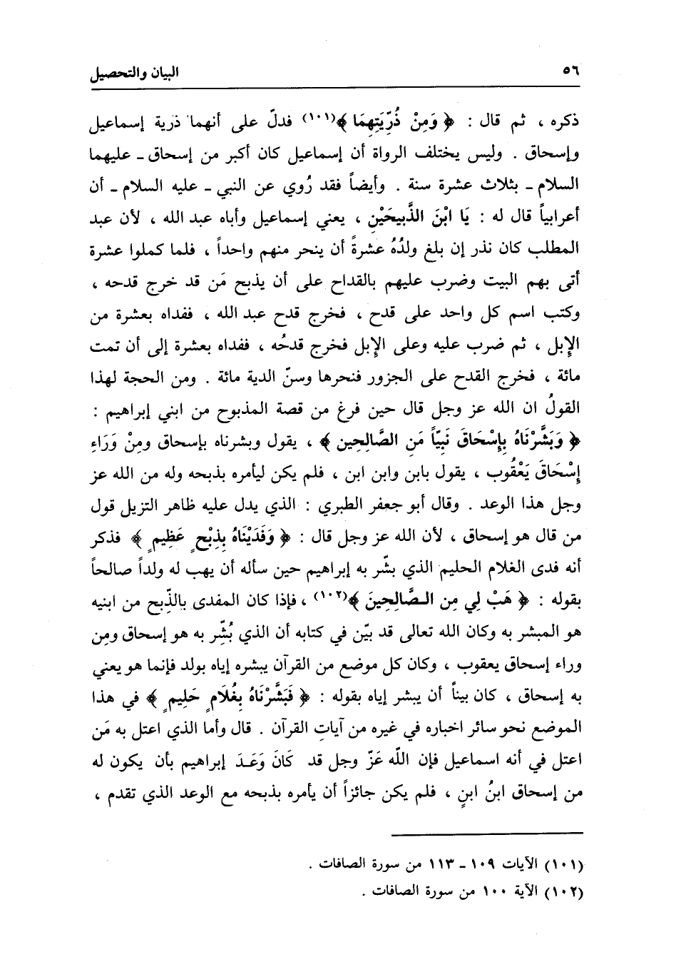 ذكره، ثم قال: {وَمِنْ ذُرِّيَّتِهِمَا} [الصافات: 113] فدل على أنهما ذرية إسماعيل وإسحاق. وليس يختلف الرواة أن إسماعيل كان أكبر من إسحاق - عَلَيْهِمَا السَّلَامُ - بثلاث عشرة سنة. وأيضا فقد روي عن النبي - عَلَيْهِ السَّلَامُ - «أن أعرابيا قال له: يا ابن الذبيحين» يعني إسماعيل وأباه عبد الله، لأن عبد المطلب كان نذر إن بلغ ولده عشرة أن ينحر منهم واحدا، فلما كملوا عشرة أتى بهم البيت وضرب عليهم بالقداح على أن يذبح من قد خرج قدحه، وكتب اسم كل واحد على قدح، فخرج قدح عبد الله، ففداه بعشرة من الإبل، ثم ضرب عليه وعلى الإبل فخرج قدحه، ففداه بعشرة إلى أن تمت مائة، فخرج القدح على الجزور فنحرها وسن الدية مائة. ومن الحجة لهذا القول أن الله عز وجل قال حين فرغ من قصة المذبوح من ابني إبراهيم: {وَبَشَّرْنَاهُ بِإِسْحَاقَ نَبِيًّا مِنَ الصَّالِحِينَ} [الصافات: 112] ، يقول: {فَبَشَّرْنَاهَا بِإِسْحَاقَ وَمِنْ وَرَاءِ إِسْحَاقَ يَعْقُوبَ} [هود: 71] يقول بابن وابن ابن، فلم يكن ليأمره بذبحه وله من الله عز وجل هذا الوعد. وقال أبو جعفر الطبري: الذي يدل عليه ظاهر التنزيل قول من قال هو إسحاق، لأن الله عز وجل قال: {وَفَدَيْنَاهُ بِذِبْحٍ عَظِيمٍ} [الصافات: 107] فذكر أنه فدى الغلام الحليم الذي بشر به إبراهيم حين سأله أن يهب له ولدا صالحا بقوله: {هَبْ لِي مِنَ الصَّالِحِينَ} [الصافات: 100] ، فإذا كان المفدى بالذبح من ابنيه هو المبشر به وكان الله تعالى قد بين في كتابه أن الذي بشر به هو إسحاق ومن وراء إسحاق يعقوب، وكان كل موضع من القرآن يبشره إياه بولد فإنما هو يعني به إسحاق، كان بينا أن يبشر إياه بقوله: {فَبَشَّرْنَاهُ بِغُلامٍ حَلِيمٍ} [الصافات: 101] في هذا الموضع نحو سائر أخباره في غيره من آيات القرآن. قال: وأما الذي اعتل به من اعتل في أنه إسماعيل فإن الله عز وجل قد كان وعد إبراهيم بأن يكون له من إسحاق ابن ابن، فلم يكن جائزا أن يأمره بذبحه مع الوعد الذي تقدم،