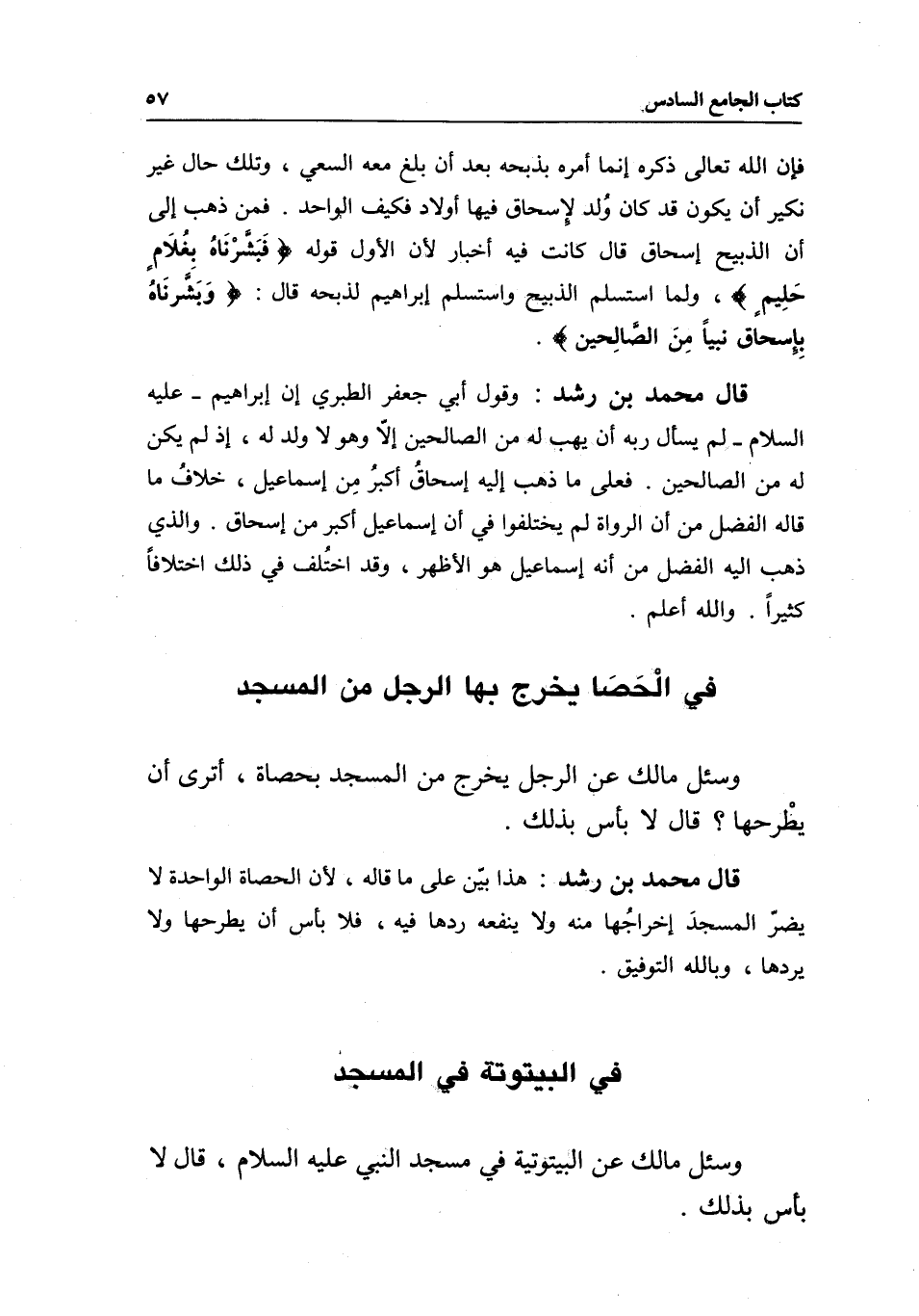 قال محمد بن رشد: وقول أبي جعفر الطبري: إن إبراهيم - عَلَيْهِ السَّلَامُ - لم يسأل ربه أن يهب له من الصالحين إلا وهو لا ولد له، إذ لم يكن له من الصالحين. فعلى ما ذهب إليه إسحاق أكبر من إسماعيل، خلاف ما قاله الفضل من أن الرواة لم يختلفوا في أن إسماعيل أكبر من إسحاق. والذي ذهب إليه الفضل من أنه إسماعيل هو الأظهر، وقد اختلف في ذلك اختلافا كثيرا. والله أعلم.