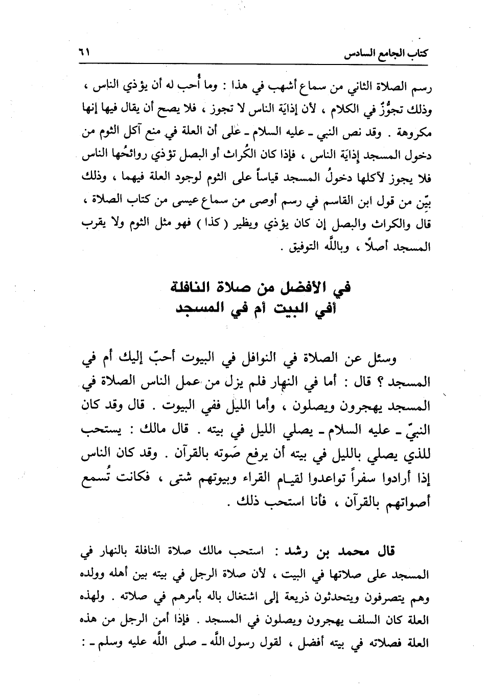قال محمد بن رشد: استحب مالك صلاة النافلة بالنهار في المسجد على صلاتها في البيت، لأن صلاة الرجل في بيته بين أهله وولده وهم يتصرفون ويتحدثون ذريعة إلى اشتغال باله بأمرهم في صلاته. ولهذه العلة كان السلف يهجرون ويصلون في المسجد. فإذا أمن الرجل من هذه العلة فصلاته في بيته أفضل، لقول رسول الله - صَلَّى اللَّهُ عَلَيْهِ وَسَلَّمَ -:
