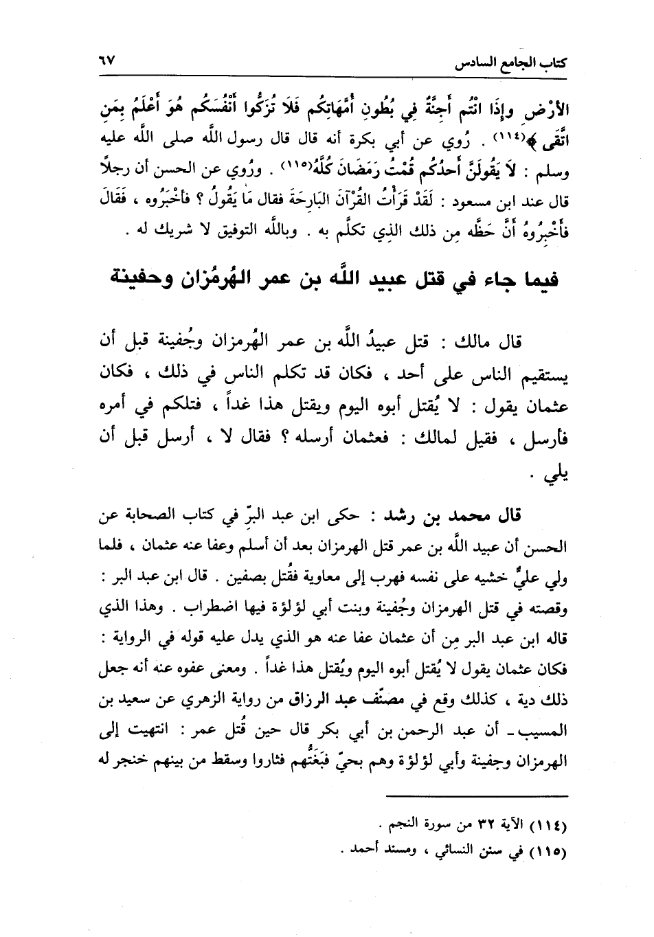 قال محمد بن رشد: حكى ابن عبد البر في كتاب الصحابة عن الحسن أن عبيد الله بن عمر قتل الهرمزان بعد أن أسلم وعفا عنه عثمان، فلما ولي علي خشيه على نفسه فهرب إلى معاوية فقتل بصفين. قال ابن عبد البر: وقصته في قتل الهرمزان وجفينة وبنت أبي لؤلؤة فيها اضطراب. وهذا الذي قاله ابن عبد البر من أن عثمان عفا عنه هو الذي يدل عليه قوله في الرواية: فكان عثمان يقول: لا يقتل أبوه اليوم ويقتل هذا غدا. ومعنى عفوه عنه أنه جعل ذلك دية، كذلك وقع في مصنف عبد الرزاق من رواية الزهري عن سعيد بن المسيب - أن عبد الرحمن بن أبي بكر قال حين قتل عمر: انتهيت إلى الهرمزان وجفينة وأبي لؤلؤة وهم بحي فبغتهم فثاروا وسقط من بينهم خنجر له