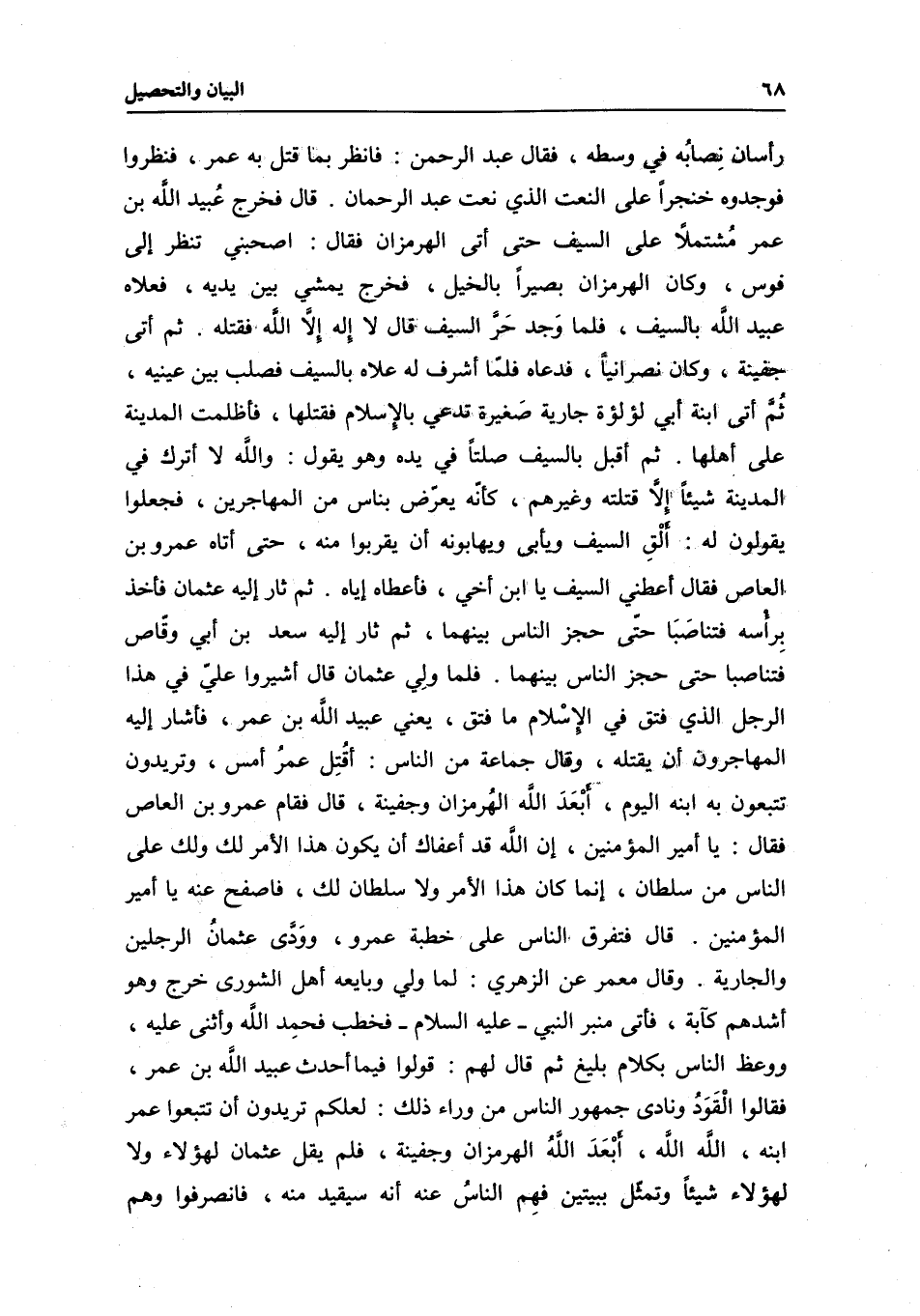 ثم أقبل بالسيف صلتا في يده وهو يقول: والله لا أترك في المدينة شيئا إلا قتلته وغيرهم، كأنه يعرض بناس من المهاجرين، فجعلوا يقولون له: ألق السيف ويأبى ويهابونه أن يقربوا منه، حتى أتاه عمرو بن العاص فقال: أعطني السيف يا ابن أخي، فأعطاه إياه. ثم ثار إليه عثمان فأخذ برأسه فتناصبا حتى حجز الناس بينهما، ثم ثار إليه سعد بن أبي وقاص فتناصبا حتى حجز الناس بينهما. فلما ولي عثمان قال: أشيروا علي في هذا الرجل الذي فتق في الإسلام ما فتق، يعني عبيد الله بن عمر، فأشار إليه المهاجرون أن يقتله، وقال جماعة من الناس: أقتل عمر أمس، وتريدون تتبعون به ابنه اليوم، أبعد الله الهرمزان وجفينة، قال: فقام عمرو بن العاص فقال: يا أمير المؤمنين، إن الله قد أعفاك أن يكون هذا الأمر لك ولك على الناس من سلطان، إنما كان هذا الأمر ولا سلطان لك، فاصفح عنه يا أمير المؤمنين. قال: فتفرق الناس على خطبة عمرو، وودى عثمان الرجلين والجارية. وقال معمر عن الزهري: لما ولي وبايعه أهل الشورى خرج وهو أشدهم كآبة، فأتى منبر النبي - عَلَيْهِ السَّلَامُ - فخطب فحمد الله وأثنى عليه، ووعظ الناس بكلام بليغ ثم قال لهم: قولوا فيما أحدث عبيد الله بن عمر، فقالوا: القود ونادى جمهور الناس من وراء ذلك: لعلكم تريدون أن تتبعوا عمر ابنه، الله الله، أبعد الله الهرمزان وجفينة، فلم يقل عثمان لهؤلاء ولا لهؤلاء شيئا وتمثل ببيتين فهم الناس عنه أنه سيقيد منه، فانصرفوا وهم