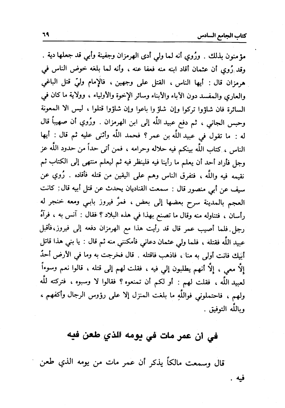 في أن عمر مات في يومه الذي طعن فيه قال: وسمعت مالكا يذكر أن عمر مات من يومه الذي طعن فيه