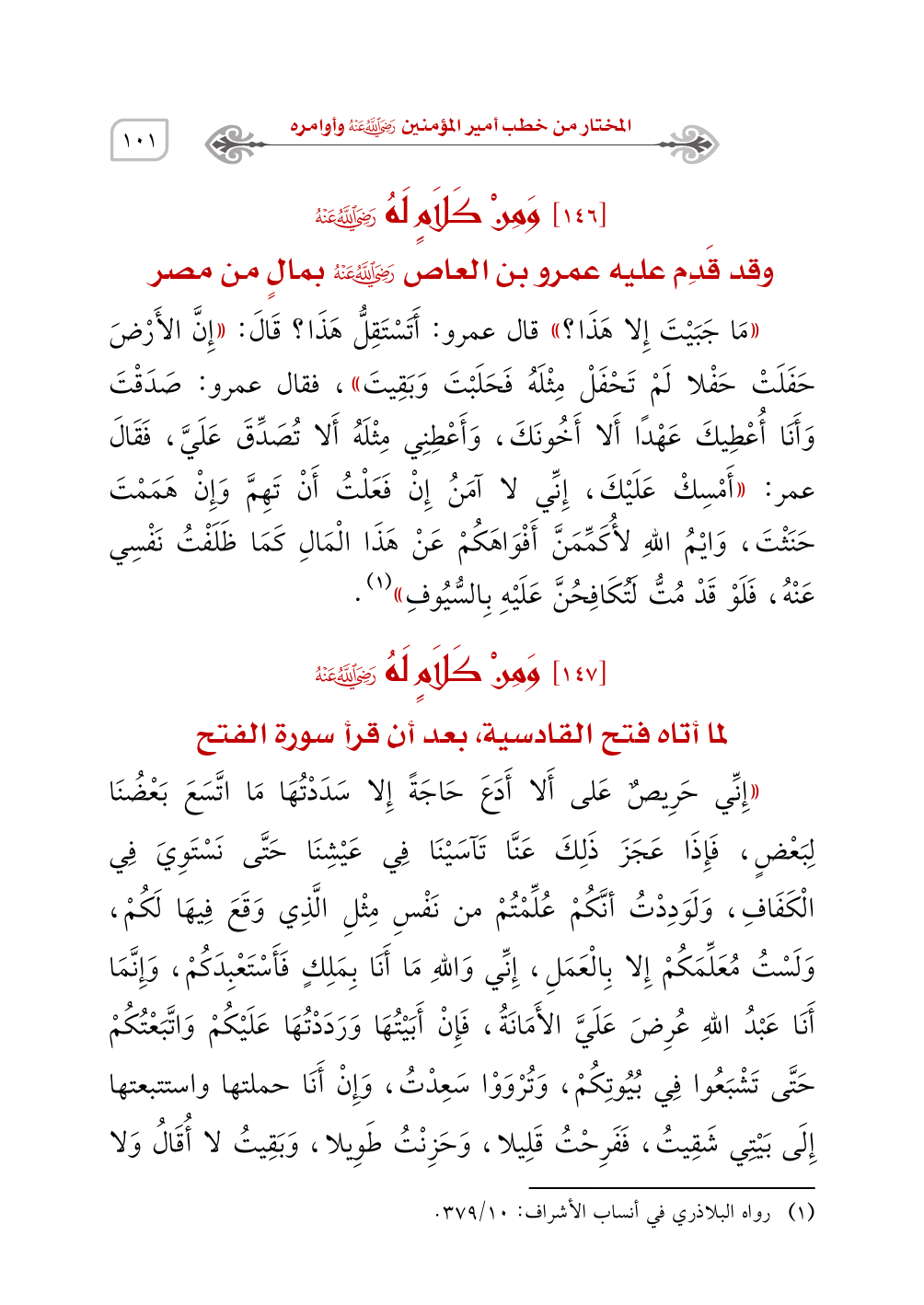 ((مَا جَبَيْتَ إِلا هَذَا؟)) قال عمرو: أَتَسْتَقِلُّ هَذَا؟ قَالَ: ((إِنَّ الأَرْضَ حَفَلَتْ حَفْلا لَمْ تَحْفَلْ مِثْلَهُ فَحَلَبْتَ وَبَقِيتَ))، فقال عمرو: صَدَقْتَ وَأَنَا أُعْطِيكَ عَهْدًا أَلا أَخُونَكَ، وَأَعْطِنِي مِثْلَهُ أَلا تُصَدِّقَ عَلَيَّ، فَقَالَ عمر: ((أَمْسِكْ عَلَيْكَ، إِنِّي لا آمَنُ إِنْ فَعَلْتُ أَنْ تَهِمَّ وَإِنْ هَمَمْتَ حَنَثْتَ، وَايْمُ اللهِ لأُكَمِّمَنَّ أَفْوَاهَكُمْ عَنْ هَذَا الْمَالِ كَمَا ظَلَفْتُ نَفْسِي عَنْهُ، فَلَوْ قَدْ مُتُّ لَتُكَافِحُنَّ عَلَيْهِ بِالسُّيُوفِ)) (¬1).
