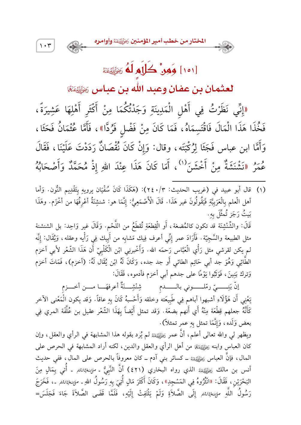 ((إِنِّي نَظَرْتُ فِي أَهْلِ الْمَدِينَةِ وَجَدْتُكُمَا مِنْ أَكْثَرِ أَهْلِهَا عَشِيرَةً، فَخُذَا هَذَا الْمَالَ فَاقْتَسِمَاهُ، فَمَا كَانَ مِنْ فَضْلٍ فَرُدَّا))، فَأَمَّا عُثْمَانُ فَحَثَا، وَأَمَّا ابن عباس فَجَثَا لِرُكْبَتَه، وقال: وَإِنْ كَانَ نُقْصَانٌ رَدَدْتَ عَلَيْنَا، فَقَالَ عُمَرُ ((نَشْنَشَةٌ مِنْ أَخْشَنَ (¬1)،