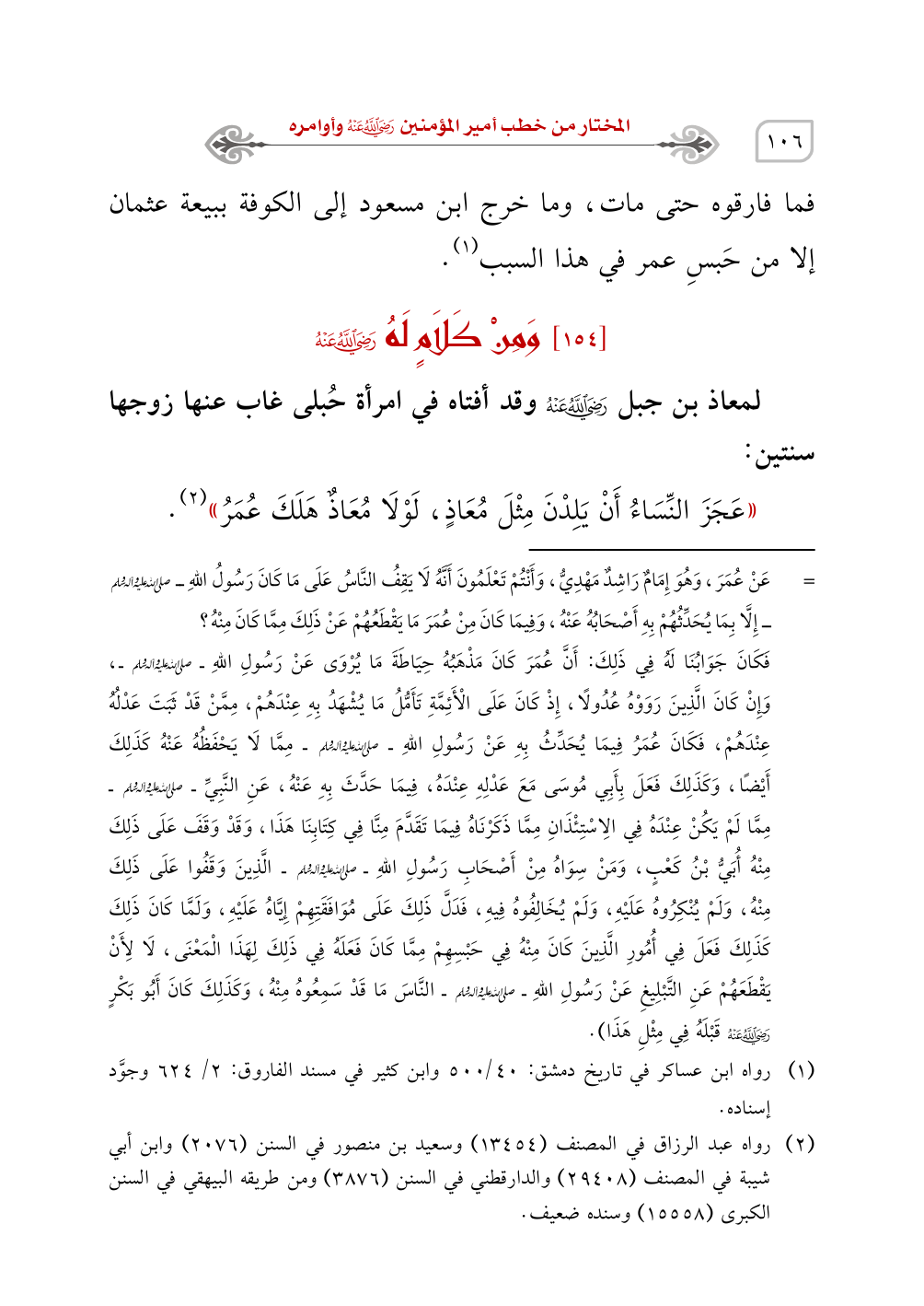 = عَنْ عُمَرَ، وَهُوَ إِمَامٌ رَاشِدٌ مَهْدِيُّ، وَأَنْتُمْ تَعْلَمُونَ أَنَّهُ لَا يَقِفُ النَّاسُ عَلَى مَا كَانَ رَسُولُ اللهِ - صَلَّى اللَّهُ عَلَيْهِ وَسَلَّمَ - إِلَّا بِمَا يُحَدِّثُهُمْ بِهِ أَصْحَابُهُ عَنْهُ، وَفِيمَا كَانَ مِنْ عُمَرَ مَا يَقْطَعُهُمْ عَنْ ذَلِكَ مِمَّا كَانَ مِنْهُ؟