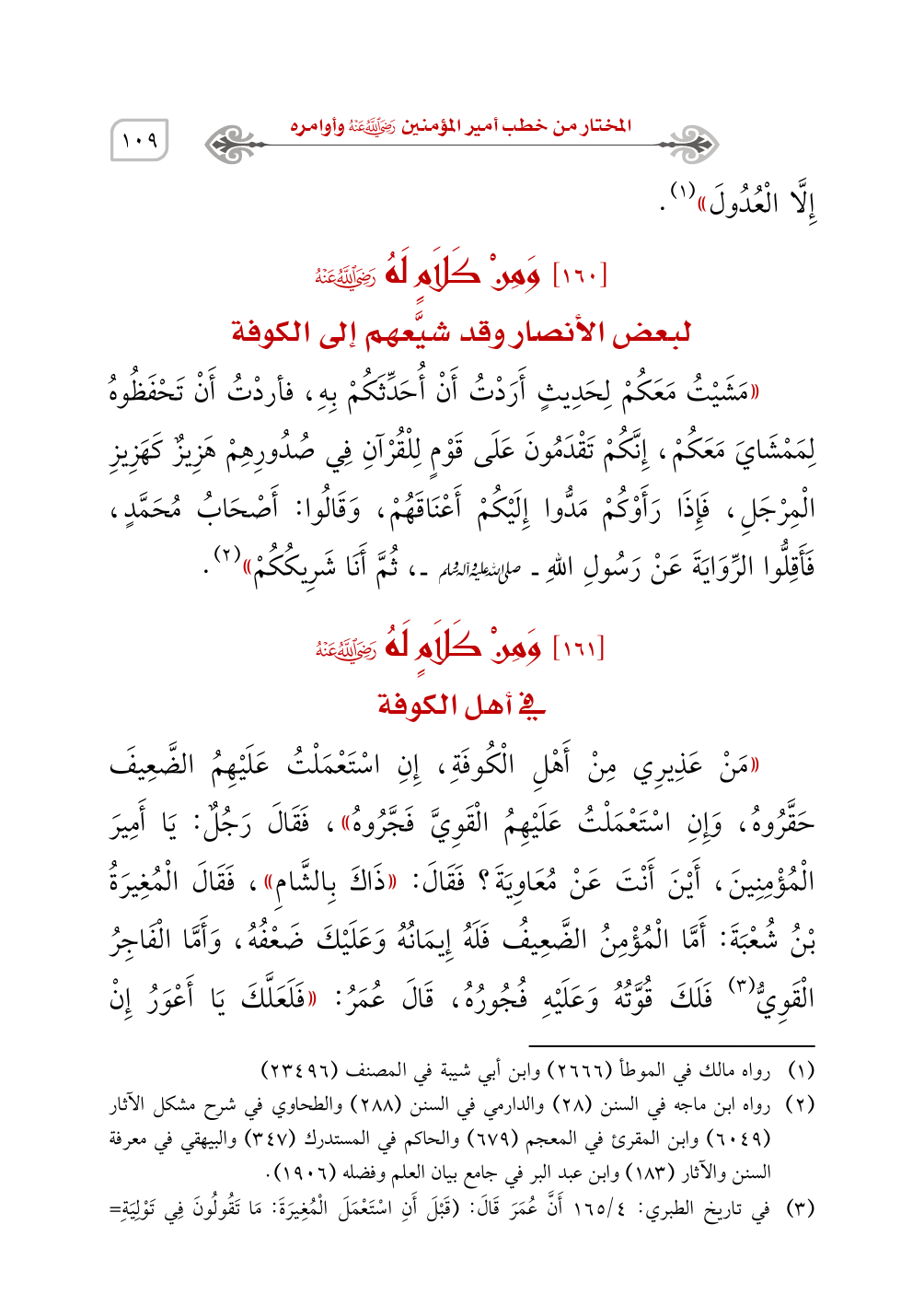 ((مَنْ عَذِيرِي مِنْ أَهْلِ الْكُوفَةِ، إِنِ اسْتَعْمَلْتُ عَلَيْهِمُ الضَّعِيفَ حَقَّرُوهُ، وَإِنِ اسْتَعْمَلْتُ عَلَيْهِمُ الْقَوِيَّ فَجَّرُوهُ))، فَقَالَ رَجُلٌ: يَا أَمِيرَ الْمُؤْمِنِينَ، أَيْنَ أَنْتَ عَنْ مُعَاوِيَةَ؟ فَقَالَ: ((ذَاكَ بِالشَّامِ))، فَقَالَ الْمُغِيرَةُ بْنُ شُعْبَةَ: أَمَّا الْمُؤْمِنُ الضَّعِيفُ فَلَهُ إِيمَانُهُ وَعَلَيْكَ ضَعْفُهُ، وَأَمَّا الْفَاجِرُ الْقَوِيُّ (¬3) فَلَكَ قُوَّتُهُ وَعَلَيْهِ فُجُورُهُ، قَالَ عُمَرُ: ((فَلَعَلَّكَ يَا أَعْوَرُ إِنْ