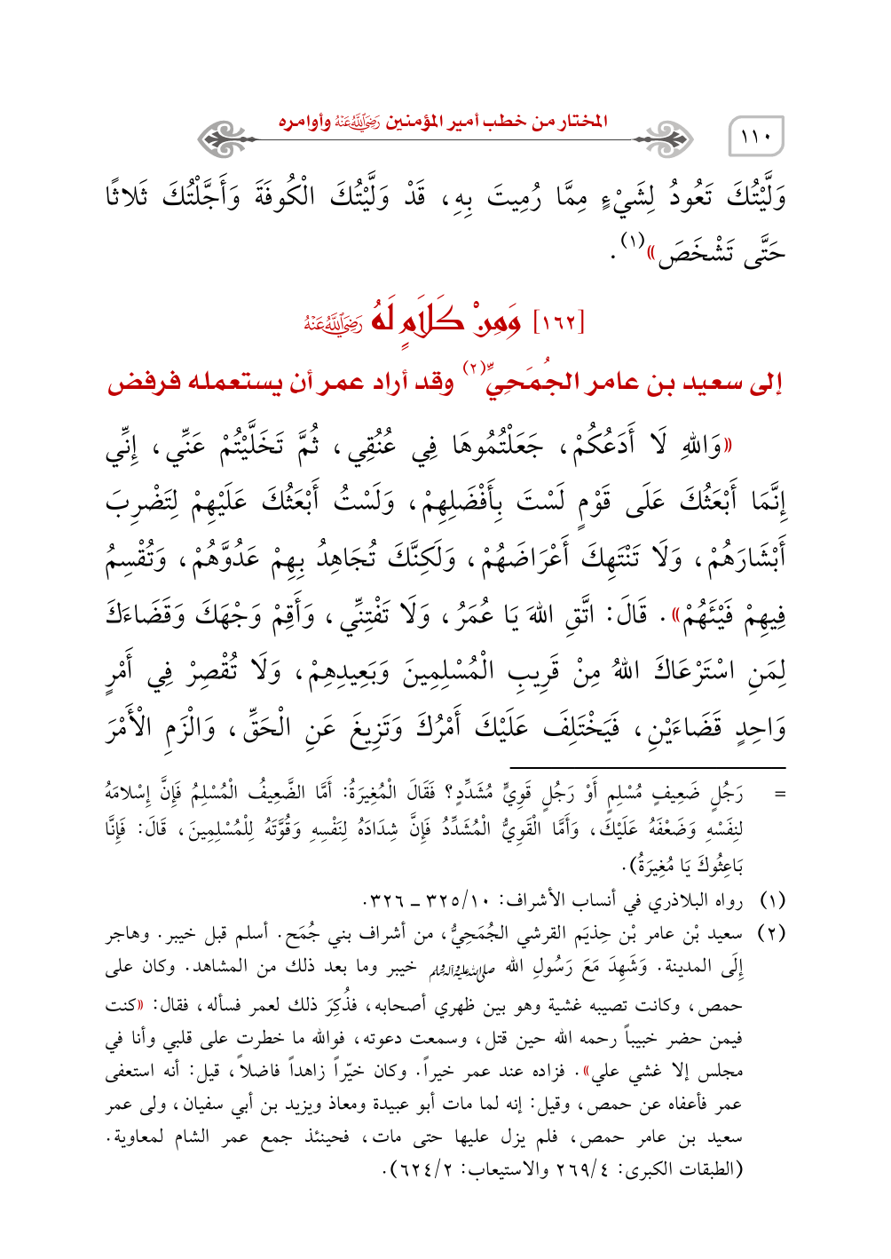 إلى سعيد بن عامر الجُمَحِيِّ (¬2) وقد أراد عمر أن يستعمله فرفض