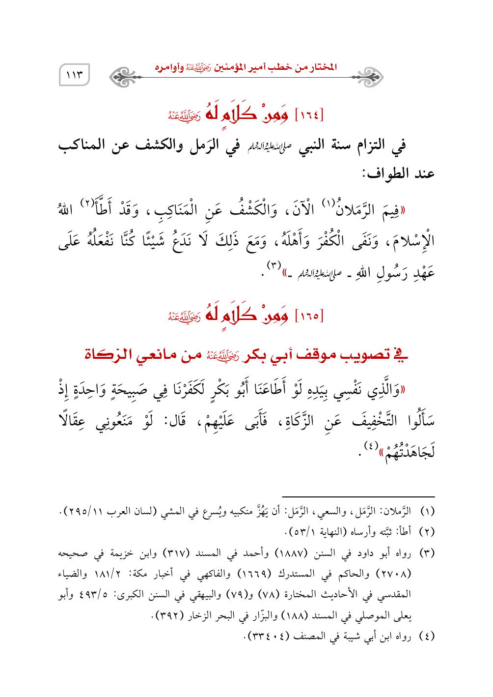 ((فِيمَ الرَّمَلانُ (¬1) الْآنَ، وَالْكَشْفُ عَنِ الْمَنَاكِبِ، وَقَدْ أَطَّأَ (¬2) اللهُ الْإِسْلامَ، وَنَفَى الْكُفْرَ وَأَهْلَهُ، وَمَعَ ذَلِكَ لَا نَدَعُ شَيْئًا كُنَّا نَفْعَلُهُ عَلَى عَهْدِ رَسُولِ اللهِ - صَلَّى اللَّهُ عَلَيْهِ وَسَلَّمَ -)) (¬3).