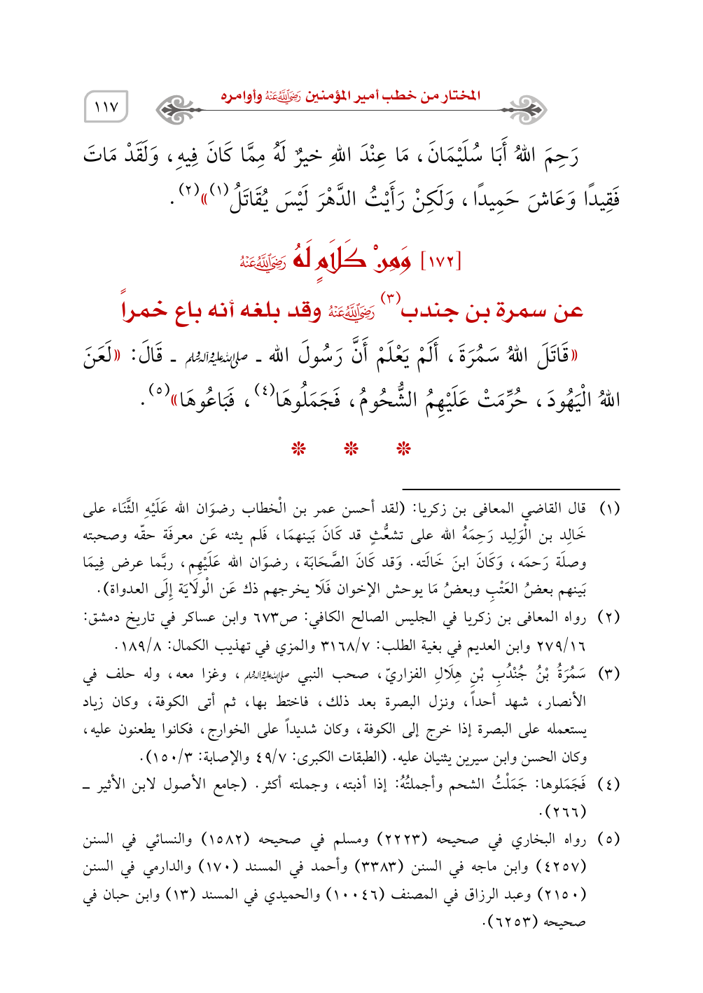 عن سمرة بن جندب (¬3) - رَضِيَ اللَّهُ عَنْهُ - وقد بلغه أنه باع خمراً