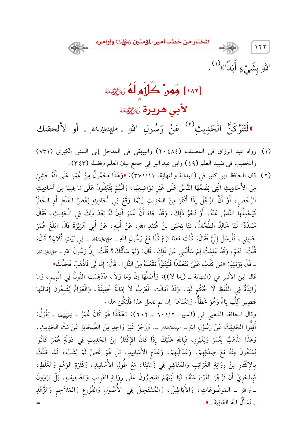 (¬2) قال الحافظ ابن كثير في (البداية والنهاية: 11/ 371): ((وَهَذَا مَحْمُولٌ مِنْ عُمَرَ عَلَى أَنَّهُ خَشِيَ مِنَ الأَحَادِيثِ الَّتِي يَضَعُهَا النَّاسُ عَلَى غَيْرِ مَوَاضِعِهَا، وَأَنَّهُمْ يَتَّكِلُونَ عَلَى مَا فِيهَا مِنْ أَحَادِيثِ الرُّخَصِ، أَوْ أَنَّ الرَّجُلَ إِذَا أَكْثَرَ مِنَ الحَدِيثِ رُبَّمَا وَقَعَ فِي أَحَادِيثِهِ بَعْضُ الغَلَطِ أَوِ الخَطَأِ فَيَحْمِلُهَا النَّاسُ عَنْهُ، أَوْ نَحْوُ ذَلِكَ. وَقَدْ جَاءَ أَنَّ عُمَرَ أَذِنَ لَهُ بَعْدَ ذَلِكَ فِي الْحَدِيثِ، فَقَالَ مُسَدَّدٌ: ثَنَا خَالِدٌ الطَّحَّانُ، ثَنَا يَحْيَى بْنُ عُبَيْدِ اللهِ، عَنْ أَبِيهِ، عَنْ أَبِي هُرَيْرَةَ قَالَ ((بَلَغَ عُمَرَ حَدِيثِي، فَأَرْسَلَ إِلَيَّ فَقَالَ: كُنْتَ مَعَنَا يَوْمَ كُنَّا مَعَ رَسُولِ اللهِ - صَلَّى اللَّهُ عَلَيْهِ وَسَلَّمَ - فِي بَيْتِ فُلَانٍ؟ قَالَ: قُلْتُ: نَعَمْ، وَقَدْ عَلِمْتُ لِمَ سَأَلَتْنِي عَنْ ذَلِكَ. قَالَ: وَلِمَ سَأَلْتُكَ؟ قُلْتُ: إِنَّ رَسُولَ اللهِ - صَلَّى اللَّهُ عَلَيْهِ وَسَلَّمَ - قَالَ يَوْمَئِذٍ: ((مَنْ كَذَبَ عَلَيَّ مُتَعَمِّدًا فَلْيَتَبَوَّا مَقْعَدَهُ مِنَ النَّارِ)). قَالَ: إِمَّا لَى فَاذْهَبْ فَحَدِّثْ)).