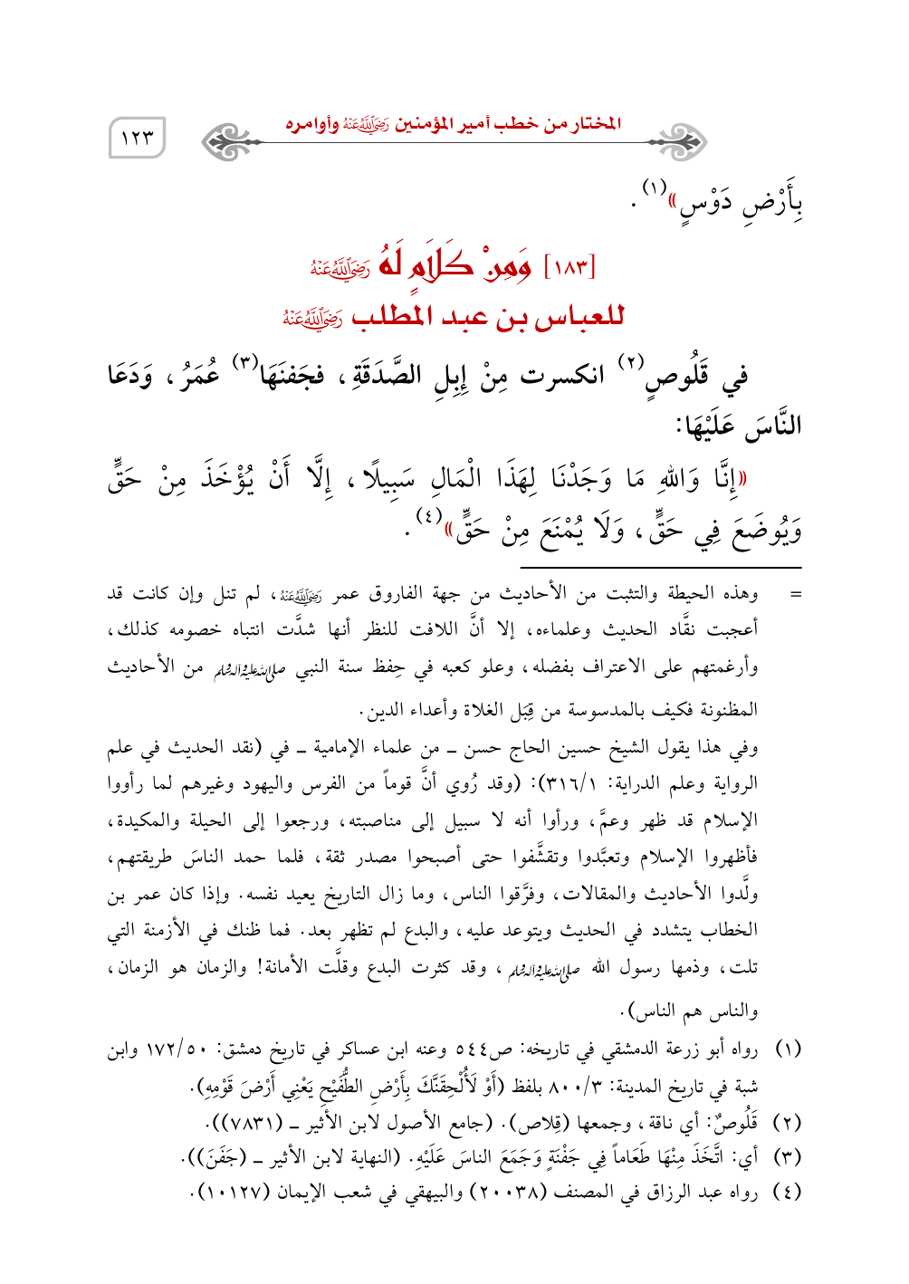 = وهذه الحيطة والتثبت من الأحاديث من جهة الفاروق عمر - رَضِيَ اللَّهُ عَنْهُ -، لم تنل وإن كانت قد أعجبت نقَّاد الحديث وعلماءه، إلا أنَّ اللافت للنظر أنها شدَّت انتباه خصومه كذلك، وأرغمتهم على الاعتراف بفضله، وعلو كعبه في حِفظ سنة النبي - صَلَّى اللَّهُ عَلَيْهِ وَسَلَّمَ - من الأحاديث المظنونة فكيف بالمدسوسة من قِبَل الغلاة وأعداء الدين.