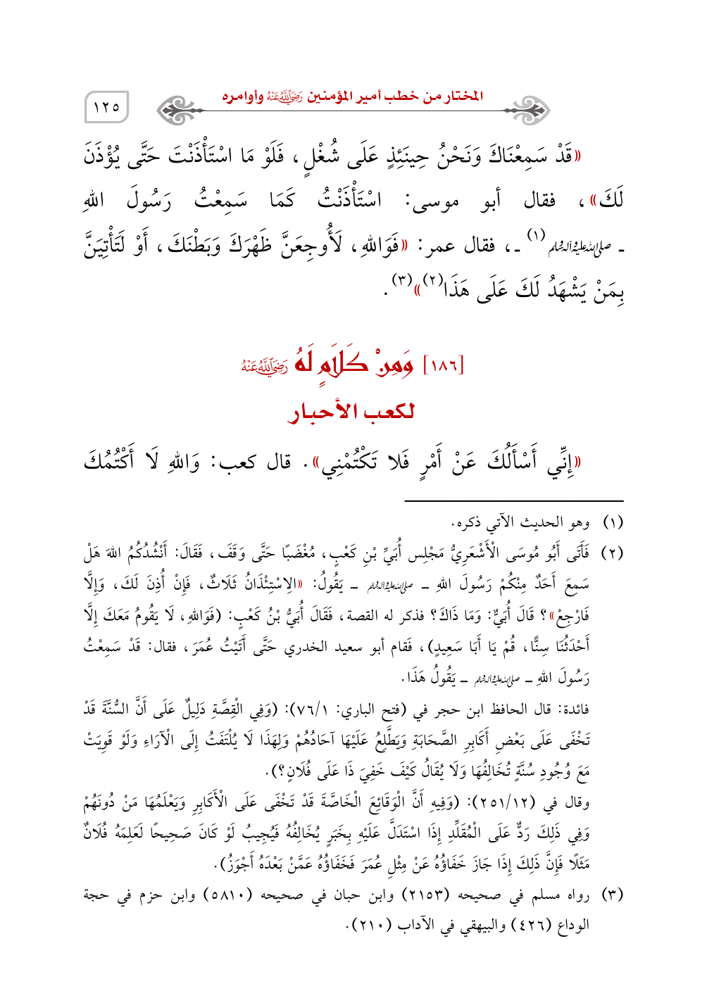 (¬2) فَأَتَى أَبُو مُوسَى الْأَشْعَرِيُّ مَجْلِس أُبَيِّ بْنِ كَعْبٍ، مُغْضَبًا حَتَّى وَقَفَ، فَقَالَ: أَنْشُدُكُمُ اللهَ هَلْ سَمِعَ أَحَدٌ مِنْكُمْ رَسُولَ اللهِ - صَلَّى اللَّهُ عَلَيْهِ وَسَلَّمَ - يَقُولُ: ((الِاسْتِئْذَانُ ثَلَاثٌ، فَإِنْ أُذِنَ لَكَ، وَإِلَّا فَارْجِعْ))؟ قَالَ أُبَيٌّ: وَمَا ذَاكَ؟ فذكر له القصة، فَقَالَ أُبَيُّ بْنُ كَعْبٍ: (فَوَاللهِ، لَا يَقُومُ مَعَكَ إِلَّا أَحْدَثُنَا سِنًّا، قُمْ يَا أَبَا سَعِيدٍ)، فَقام أبو سعيد الخدري حَتَّى أَتَيْتُ عُمَرَ، فقال: قَدْ سَمِعْتُ رَسُولَ اللهِ - صَلَّى اللَّهُ عَلَيْهِ وَسَلَّمَ - يَقُولُ هَذَا.
