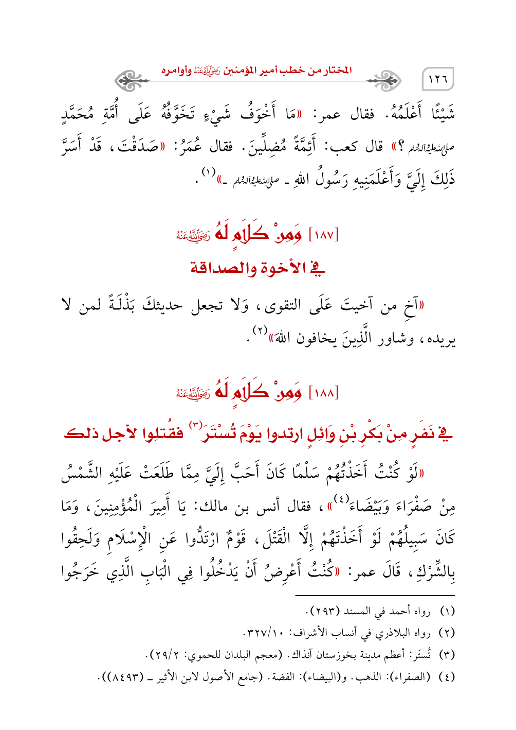 ((لَوْ كُنْتُ أَخَذْتُهُمْ سَلْمًا كَانَ أَحَبَّ إِلَيَّ مِمَّا طَلَعَتْ عَلَيْهِ الشَّمْسُ مِنْ صَفْرَاءَ وَبَيْضَاءَ (¬4)))، فقال أنس بن مالك: يَا أَمِيرَ الْمُؤْمِنِينَ، وَمَا كَانَ سَبِيلُهُمْ لَوْ أَخَذْتَهُمْ إِلَّا الْقَتْلَ، قَوْمٌ ارْتَدُّوا عَنِ الْإِسْلَامِ وَلَحِقُوا بِالشِّرْكِ، قَالَ عمر: ((كُنْتُ أَعْرِضُ أَنْ يَدْخُلُوا فِي الْبَابِ الَّذِي خَرَجُوا