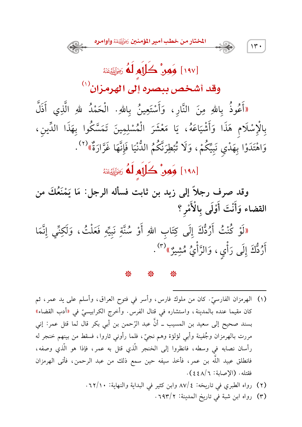 (¬1) الهرمزان الفارسيّ. كان من ملوك فارس، وأسر في فتوح العراق، وأسلم على يد عمر، ثم كان مقيما عنده بالمدينة، واستشاره في قتال الفرس. وأخرج الكرابيسيّ في ((أدب القضاء)) بسند صحيح إلى سعيد بن المسيب - أنَّ عبد الرّحمن بن أبي بكر قال لما قتل عمر: إني مررت بالهرمزان وجُفينة وأبي لؤلؤة وهم نجيّ، فلما رأوني ثاروا، فسقط من بينهم خنجر له رأسان نصابه في وسطه، فانظروا إلى الخنجر الّذي قتل به عمر، فإذا هو الّذي وصفه، فانطلق عبيد اللَّه بن عمر، فأخذ سيفه حين سمع ذلك من عبد الرحمن، فأتى الهرمزان فقتله. (الإصابة: 6/ 448).