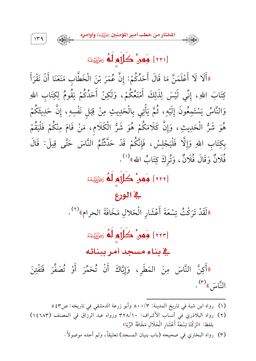 ((أَلَا لَا أَعْلَمَنَّ مَا قَالَ أَحَدُكُمْ: إِنَّ عُمَرَ بْنَ الْخَطَّابِ مَنَعَنَا أَنْ نَقْرَأَ كِتَابَ اللهِ، إِنِّي لَيْسَ لِذَلِكَ أَمْنَعُكُمْ، وَلَكِنْ أَحَدُكُمْ يَقُومُ لِكِتَابِ اللهِ وَالنَّاسُ يَسْتَمِعُونَ إِلَيْهِ، ثُمَّ يَاتِي بِالْحَدِيثِ مِنْ قِبَلِ نَفْسِهِ، إِنَّ حَدِيثَكُمْ هُوَ شَرُّ الْحَدِيثِ، وَإِنَّ كَلَامَكُمْ هُوَ شَرُّ الْكَلَامِ، مَنْ قَامَ مِنْكُمْ فَلْيَقُمْ بِكِتَابِ اللهِ وَإِلَّا فَلْيَجْلِسْ، فَإِنَّكُمْ قَدْ حَدَّثْتُمُ النَّاسَ حَتَّى قِيلَ: قَالَ فُلَانٌ وَقَالَ فُلَانٌ، وَتُرِكَ كِتَابُ الله)) (¬1).