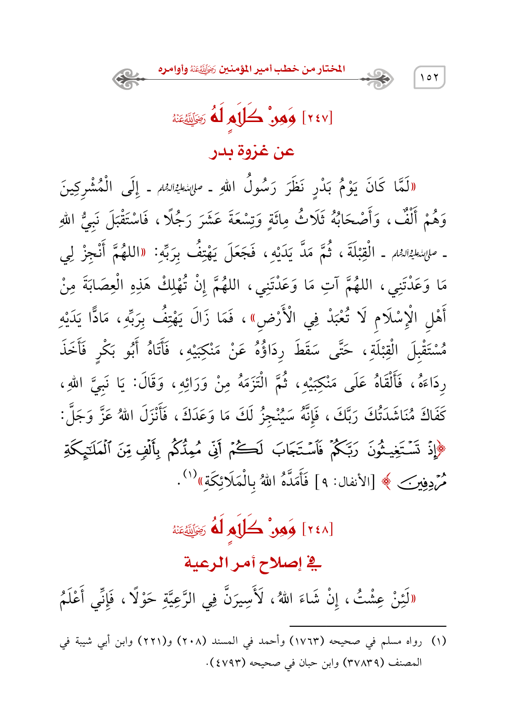 ((لَمَّا كَانَ يَوْمُ بَدْرٍ نَظَرَ رَسُولُ اللهِ - صَلَّى اللَّهُ عَلَيْهِ وَسَلَّمَ - إِلَى الْمُشْرِكِينَ وَهُمْ أَلْفٌ، وَأَصْحَابُهُ ثَلَاثُ مِائَةٍ وَتِسْعَةَ عَشَرَ رَجُلًا، فَاسْتَقْبَلَ نَبِيُّ اللهِ - صَلَّى اللَّهُ عَلَيْهِ وَسَلَّمَ - الْقِبْلَةَ، ثُمَّ مَدَّ يَدَيْهِ، فَجَعَلَ يَهْتِفُ بِرَبِّهِ: ((اللهُمَّ أَنْجِزْ لِي مَا وَعَدْتَنِي، اللهُمَّ آتِ مَا وَعَدْتَنِي، اللهُمَّ إِنْ تُهْلِكْ هَذِهِ الْعِصَابَةَ مِنْ أَهْلِ الْإِسْلَامِ لَا تُعْبَدْ فِي الْأَرْضِ))، فَمَا زَالَ يَهْتِفُ بِرَبِّهِ، مَادًّا يَدَيْهِ مُسْتَقْبِلَ الْقِبْلَةِ، حَتَّى سَقَطَ رِدَاؤُهُ عَنْ مَنْكِبَيْهِ، فَأَتَاهُ أَبُو بَكْرٍ فَأَخَذَ رِدَاءَهُ، فَأَلْقَاهُ عَلَى مَنْكِبَيْهِ، ثُمَّ الْتَزَمَهُ مِنْ وَرَائِهِ، وَقَالَ: يَا نَبِيَّ اللهِ، كَفَاكَ مُنَاشَدَتُكَ رَبَّكَ، فَإِنَّهُ سَيُنْجِزُ لَكَ مَا وَعَدَكَ، فَأَنْزَلَ اللهُ عَزَّ وَجَلَّ: {إِذْ تَسْتَغِيثُونَ رَبَّكُمْ فَاسْتَجَابَ لَكُمْ أَنِّي مُمِدُّكُمْ بِأَلْفٍ مِنَ الْمَلَائِكَةِ مُرْدِفِينَ} [الأنفال: 9] فَأَمَدَّهُ اللهُ بِالْمَلَائِكَةِ)) (¬1).