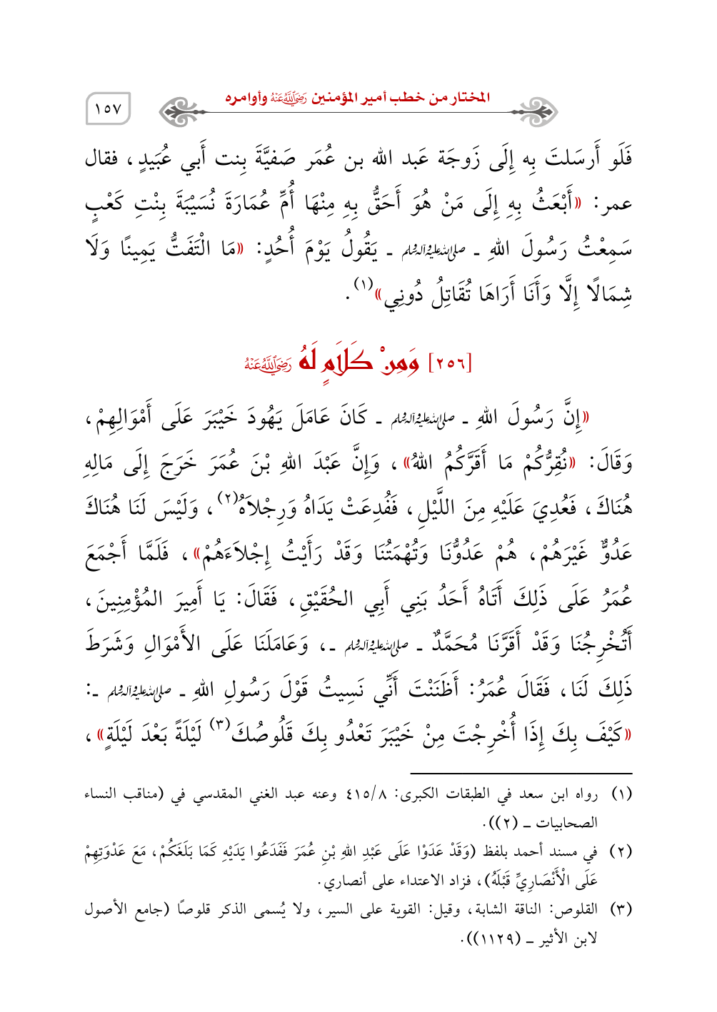((إِنَّ رَسُولَ اللهِ - صَلَّى اللَّهُ عَلَيْهِ وَسَلَّمَ - كَانَ عَامَلَ يَهُودَ خَيْبَرَ عَلَى أَمْوَالِهِمْ، وَقَالَ: ((نُقِرُّكُمْ مَا أَقَرَّكُمُ اللهُ))، وَإِنَّ عَبْدَ اللهِ بْنَ عُمَرَ خَرَجَ إِلَى مَالِهِ هُنَاكَ، فَعُدِيَ عَلَيْهِ مِنَ اللَّيْلِ، فَفُدِعَتْ يَدَاهُ وَرِجْلاَهُ (¬2)، وَلَيْسَ لَنَا هُنَاكَ عَدُوٌّ غَيْرَهُمْ، هُمْ عَدُوُّنَا وَتُهْمَتُنَا وَقَدْ رَأَيْتُ إِجْلاَءَهُمْ))، فَلَمَّا أَجْمَعَ عُمَرُ عَلَى ذَلِكَ أَتَاهُ أَحَدُ بَنِي أَبِي الحُقَيْقِ، فَقَالَ: يَا أَمِيرَ المُؤْمِنِينَ، أَتُخْرِجُنَا وَقَدْ أَقَرَّنَا مُحَمَّدٌ - صَلَّى اللَّهُ عَلَيْهِ وَسَلَّمَ -، وَعَامَلَنَا عَلَى الأَمْوَالِ وَشَرَطَ ذَلِكَ لَنَا، فَقَالَ عُمَرُ: أَظَنَنْتَ أَنِّي نَسِيتُ قَوْلَ رَسُولِ اللهِ - صَلَّى اللَّهُ عَلَيْهِ وَسَلَّمَ -: ((كَيْفَ بِكَ إِذَا أُخْرِجْتَ مِنْ خَيْبَرَ تَعْدُو بِكَ قَلُوصُكَ (¬3) لَيْلَةً بَعْدَ لَيْلَةٍ))،