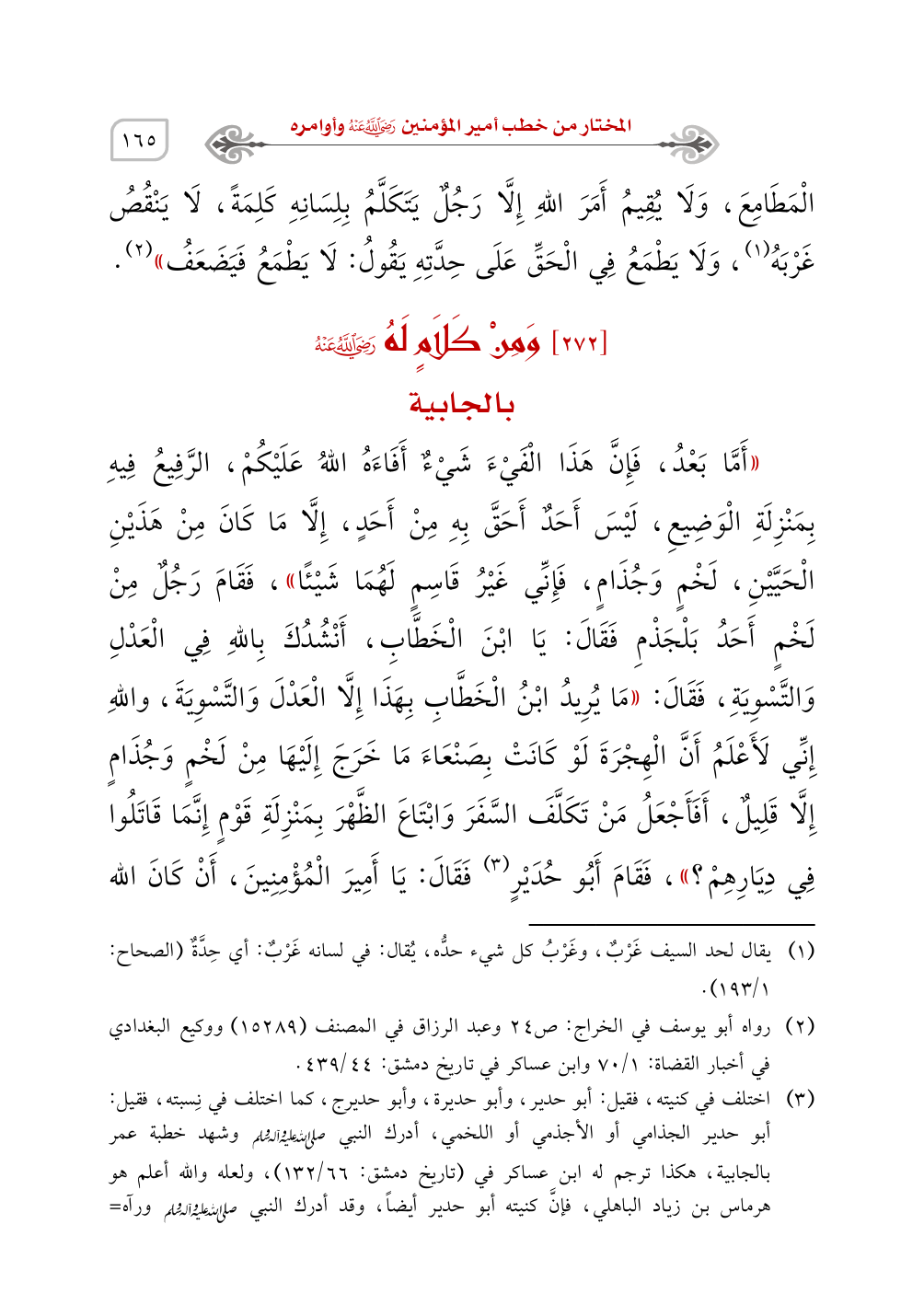 ((أَمَّا بَعْدُ، فَإِنَّ هَذَا الْفَيْءَ شَيْءٌ أَفَاءَهُ اللهُ عَلَيْكُمْ، الرَّفِيعُ فِيهِ بِمَنْزِلَةِ الْوَضِيعِ، لَيْسَ أَحَدٌ أَحَقَّ بِهِ مِنْ أَحَدٍ، إِلَّا مَا كَانَ مِنْ هَذَيْنِ الْحَيَّيْنِ، لَخْمٍ وَجُذَامٍ، فَإِنِّي غَيْرُ قَاسِمٍ لَهُمَا شَيْئًا))، فَقَامَ رَجُلٌ مِنْ لَخْمٍ أَحَدُ بَلْجَذْمِ فَقَالَ: يَا ابْنَ الْخَطَّابِ، أَنْشُدُكَ بِاللهِ فِي الْعَدْلِ وَالتَّسْوِيَةِ، فَقَالَ: ((مَا يُرِيدُ ابْنُ الْخَطَّابِ بِهَذَا إِلَّا الْعَدْلَ وَالتَّسْوِيَةَ، واللهِ إِنِّي لَأَعْلَمُ أَنَّ الْهِجْرَةَ لَوْ كَانَتْ بِصَنْعَاءَ مَا خَرَجَ إِلَيْهَا مِنْ لَخْمٍ وَجُذَامٍ إِلَّا قَلِيلٌ، أَفَأَجْعَلُ مَنْ تَكَلَّفَ السَّفَرَ وَابْتَاعَ الظَّهْرَ بِمَنْزِلَةِ قَوْمٍ إِنَّمَا قَاتَلُوا فِي دِيَارِهِمْ؟))، فَقَامَ أَبُو حُدَيْرٍ (¬3)
