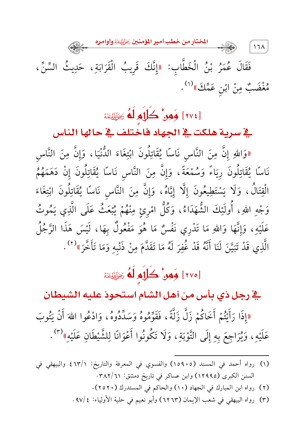 (¬1) رواه أحمد في المسند (15905) والفسوي في المعرفة والتاريخ: 1/ 463 والبيهقي في السنن الكبرى (12995) وابن عساكر في تاريخ دمشق: 61/ 382.