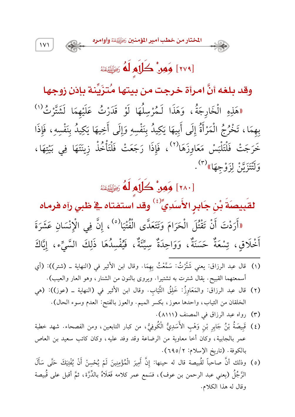 (¬5) وذلك أنَّ صاحباً لقُبيصة قال له حينها: إِنَّ أَمِيرَ الْمُؤْمِنِينَ لَمْ يُحْسِنْ أَنْ يُفْتِيَكَ حَتَّى سَأَلَ الرَّجُلُ (يعني عبد الرحمن بن عوف)، فسَمع عمر كلامه فَعَلَاهُ بالدِّرَّة، ثمَّ أقبل على قُبيصة وقال له هذا الكلام.