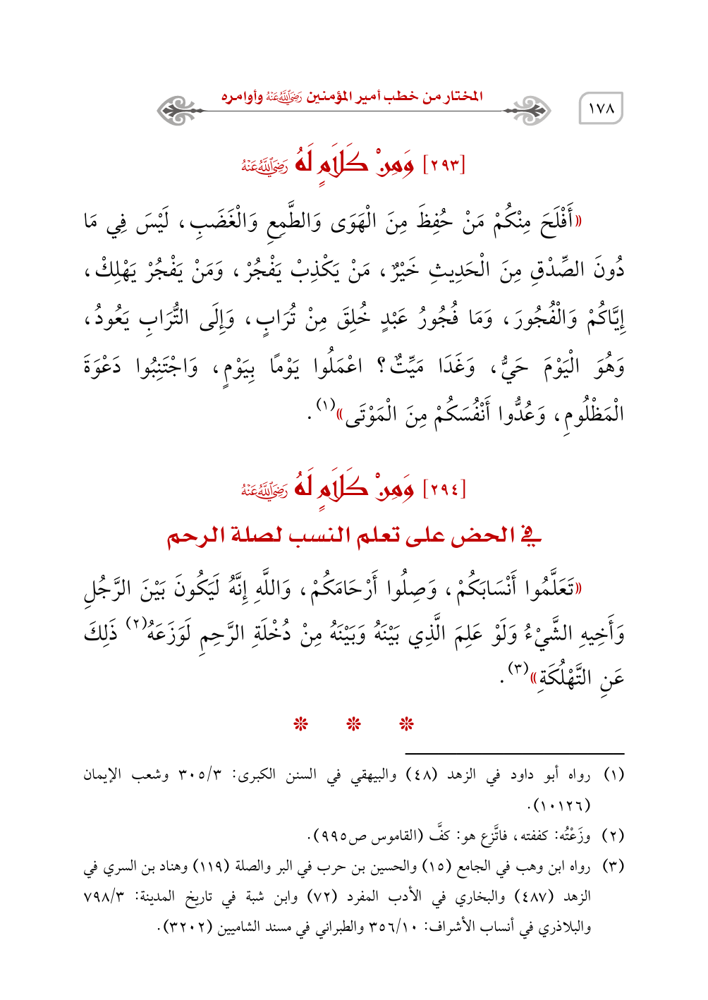 (¬3) رواه ابن وهب في الجامع (15) والحسين بن حرب في البر والصلة (119) وهناد بن السري في الزهد (487) والبخاري في الأدب المفرد (72) وابن شبة في تاريخ المدينة: 3/ 798 والبلاذري في أنساب الأشراف: 10/ 356 والطبراني في مسند الشاميين (3202).