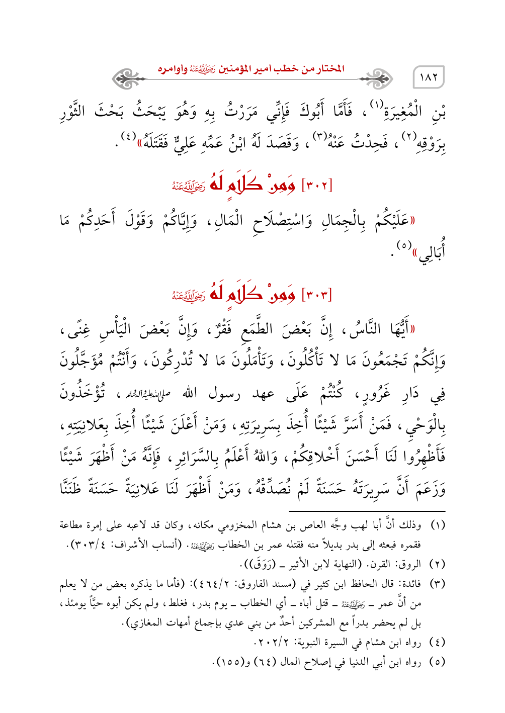 (¬1) وذلك أنَّ أبا لهب وجَّه العاص بن هشام المخزومي مكانه، وكان قد لاعبه على إمرة مطاعة فقمره فبعثه إلى بدر بديلاً منه فقتله عمر بن الخطاب - رَضِيَ اللَّهُ عَنْهُ -. (أنساب الأشراف: 4/ 303).