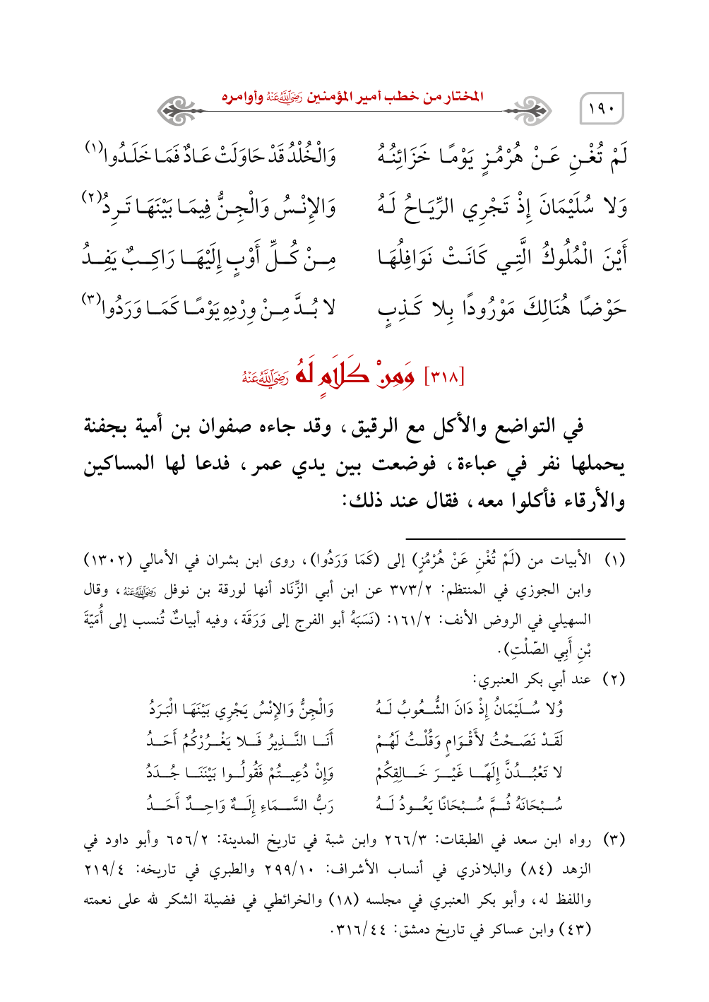 (¬3) رواه ابن سعد في الطبقات: 3/ 266 وابن شبة في تاريخ المدينة: 2/ 656 وأبو داود في الزهد (84) والبلاذري في أنساب الأشراف: 10/ 299 والطبري في تاريخه: 4/ 219 واللفظ له، وأبو بكر العنبري في مجلسه (18) والخرائطي في فضيلة الشكر لله على نعمته (43) وابن عساكر في تاريخ دمشق: 44/ 316.