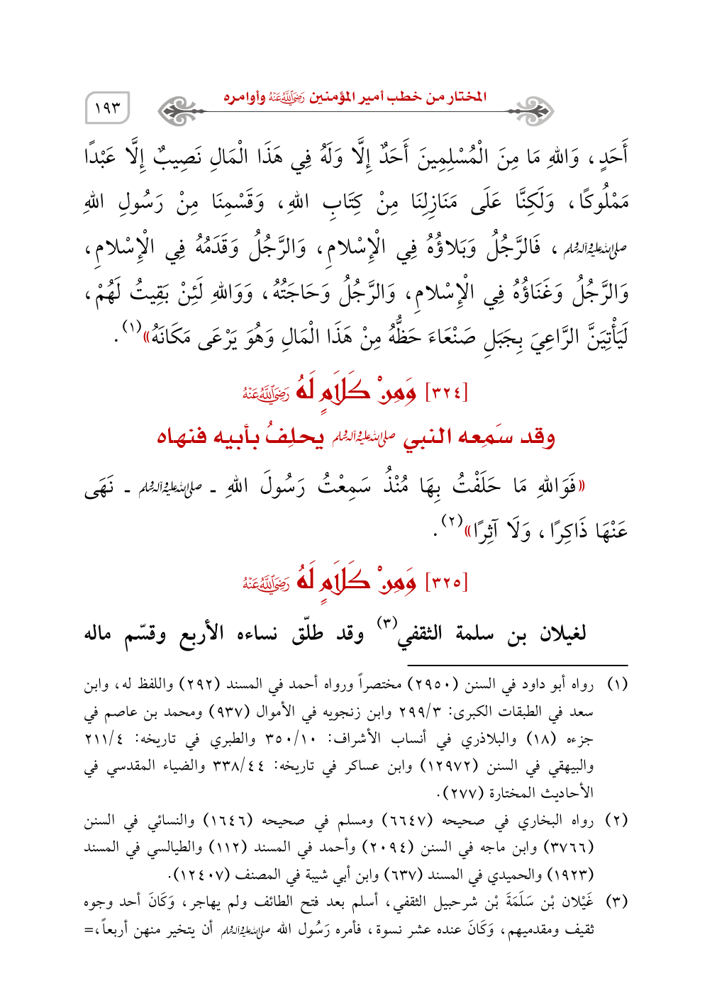 (¬1) رواه أبو داود في السنن (2950) مختصراً ورواه أحمد في المسند (292) واللفظ له، وابن سعد في الطبقات الكبرى: 3/ 299 وابن زنجويه في الأموال (937) ومحمد بن عاصم في جزءه (18) والبلاذري في أنساب الأشراف: 10/ 350 والطبري في تاريخه: 4/ 211 والبيهقي في السنن (12972) وابن عساكر في تاريخه: 44/ 338 والضياء المقدسي في الأحاديث المختارة (277).