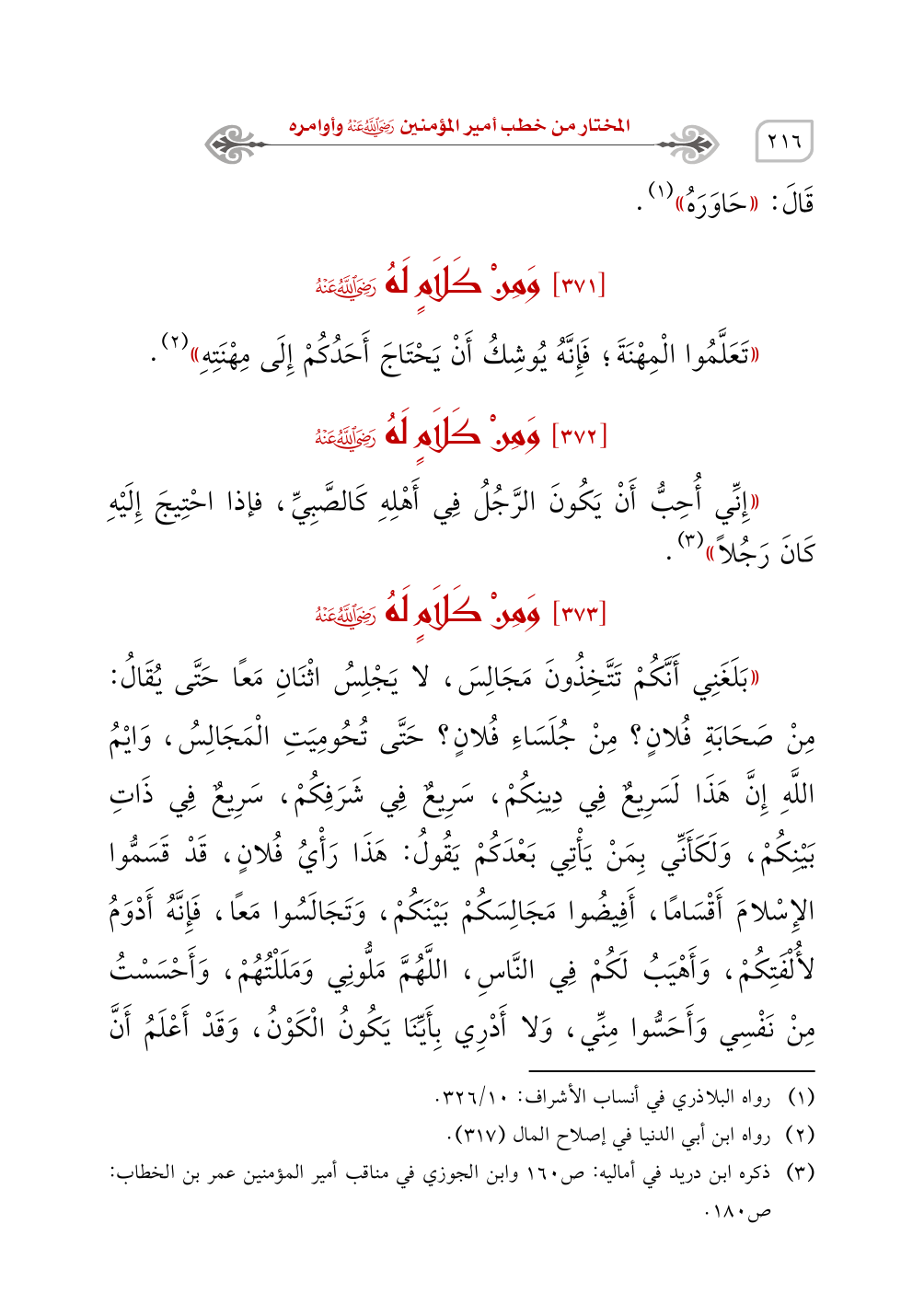 ((بَلَغَنِي أَنَّكُمْ تَتَّخِذُونَ مَجَالِسَ، لا يَجْلِسُ اثْنَانِ مَعًا حَتَّى يُقَالُ: مِنْ صَحَابَةِ فُلانٍ؟ مِنْ جُلَسَاءِ فُلانٍ؟ حَتَّى تُحُومِيَتِ الْمَجَالِسُ، وَايْمُ اللَّهِ إِنَّ هَذَا لَسَرِيعٌ فِي دِينِكُمْ، سَرِيعٌ فِي شَرَفِكُمْ، سَرِيعٌ فِي ذَاتِ بَيْنِكُمْ، وَلَكَأَنِّي بِمَنْ يَاتِي بَعْدَكُمْ يَقُولُ: هَذَا رَايُ فُلانٍ، قَدْ قَسَمُّوا الإِسْلامَ أَقْسَامًا، أَفِيضُوا مَجَالِسَكُمْ بَيْنَكُمْ، وَتَجَالَسُوا مَعًا، فَإِنَّهُ أَدْوَمُ لأُلْفَتِكُمْ، وَأَهْيَبُ لَكُمْ فِي النَّاسِ، اللَّهُمَّ مَلُّونِي وَمَلَلْتُهُمْ، وَأَحْسَسْتُ مِنْ نَفْسِي وَأَحَسُّوا مِنِّي، وَلا أَدْرِي بِأَيِّنَا يَكُونُ الْكَوْنُ، وَقَدْ أَعْلَمُ أَنَّ