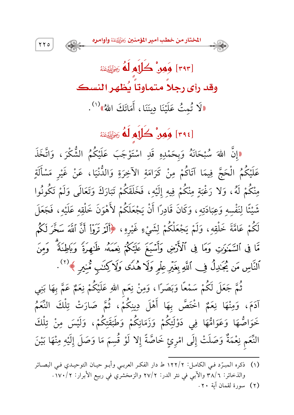 ((إِنَّ اللهَ سُبْحَانَهُ وَبِحَمْدِهِ قَدِ اسْتَوْجَبَ عَلَيْكُمُ الشُّكْرَ، وَاتَّخَذَ عَلَيْكُمُ الْحَجَّ فِيمَا آتَاكُمْ مِنْ كَرَامَةِ الآخِرَةِ وَالدُّنْيَا، عَنْ غَيْرِ مَسْأَلَةٍ مِنْكُمْ لَهُ، وَلا رَغْبَةٍ مِنْكُمْ فِيهِ إِلَيْهِ، فَخَلَقَكُمْ تَبَارَكَ وَتَعَالَى وَلَمْ تَكُونُوا شَيْئًا لِنَفْسِهِ وَعِبَادَتِهِ، وَكَانَ قَادِرًا أَنْ يَجْعَلَكُمْ لأَهْوَنَ خَلْقِهِ عَلَيْهِ، فَجَعَلَ لَكُمْ عَامَّةَ خَلْقِهِ، وَلَمْ يَجْعَلْكُمْ لِشَيْءٍ غَيْرِهِ، {أَلَمْ تَرَوْا أَنَّ اللَّهَ سَخَّرَ لَكُمْ مَا فِي السَّمَاوَاتِ وَمَا فِي الْأَرْضِ وَأَسْبَغَ عَلَيْكُمْ نِعَمَهُ ظَاهِرَةً وَبَاطِنَةً وَمِنَ النَّاسِ مَنْ يُجَادِلُ فِي اللَّهِ بِغَيْرِ عِلْمٍ وَلَا هُدًى وَلَا كِتَابٍ مُنِيرٍ} (¬2).
