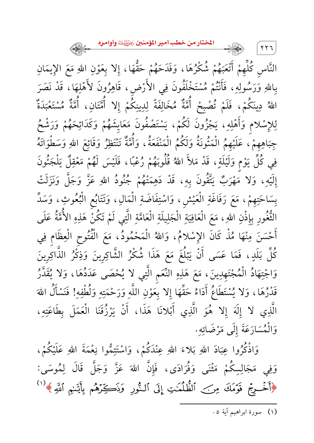 النَّاسِ كُلِّهِمْ أَتْعَبَهُمْ شُكْرُهَا، وَفَدَحَهُمْ حَقُّهَا، إِلا بِعَوْنِ اللهِ مَعَ الإِيمَانِ بِاللهِ وَرَسُولِهِ، فَأَنْتُمْ مُسْتَخْلَفُونَ فِي الأَرْضِ، قَاهِرُونَ لأَهْلِهَا، قَدْ نَصَرَ اللهُ دِينَكُمْ، فَلَمْ تُصْبِحْ أُمَّةٌ مُخَالِفَةً لِدِينِكُمْ إِلا أُمَّتَانِ، أُمَّةٌ مُسْتَعْبَدَةٌ لِلإِسْلامِ وَأَهْلِهِ، يَجْزُونَ لَكُمْ، يَسْتَصْفُونَ مَعَايِشَهُمْ وَكَدَائِحَهُمْ وَرَشْحُ جِبَاهِهِمْ، عَلَيْهِمُ الْمَئُونَةُ وَلَكُمُ الْمَنْفَعَةُ، وَأُمَّةٌ تَنْتَظِرُ وَقَائِعَ اللهِ وَسَطْوَاتَهُ فِي كُلِّ يَوْمٍ وَلَيْلَةٍ، قَدْ مَلأَ اللهُ قُلُوبَهُمْ رُعْبًا، فَلَيْسَ لَهُمْ مَعْقِلٌ يَلْجَئُونَ إِلَيْهِ، وَلا مَهْرَبٌ يَتَّقُونَ بِهِ، قَدْ دَهِمَتْهُمْ جُنُودُ اللهِ عَزَّ وَجَلَّ وَنَزَلَتْ بِسَاحَتِهِمْ، مَعَ رَفَاغَةِ الْعَيْشِ، وَاسْتِفَاضَةِ الْمَالِ، وَتَتَابُعِ الْبُعُوثِ، وَسَدِّ الثُّغُورِ بِإِذْنِ اللهِ، مَعَ الْعَافِيَةِ الْجَلِيلَةِ الْعَامَّةِ الَّتِي لَمْ تَكُنْ هَذِهِ الأُمَّةُ عَلَى أَحْسَنَ مِنْهَا مُذْ كَانَ الإِسْلامُ، وَاللهُ الْمَحْمُودُ، مَعَ الْفُتُوحِ الْعِظَامِ فِي كُلِّ بَلَدٍ، فَمَا عَسَى أَنْ يَبْلُغَ مَعَ هَذَا شُكْرُ الشَّاكِرِينَ وَذِكْرُ الذَّاكِرِينَ وَاجْتِهَادُ الْمُجْتَهِدِينَ، مَعَ هَذِهِ النِّعَمِ الَّتِي لا يُحْصَى عَدَدُهَا، وَلا يُقَدَّرُ