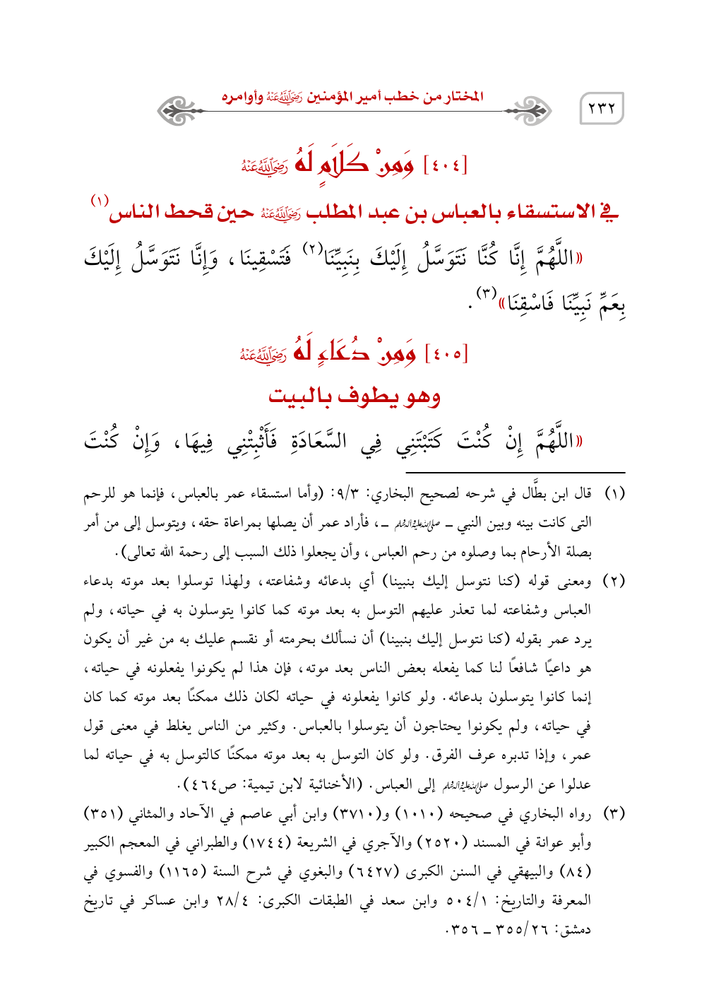 (¬1) قال ابن بطَّال في شرحه لصحيح البخاري: 3/ 9: (وأما استسقاء عمر بالعباس، فإنما هو للرحم التى كانت بينه وبين النبي - صَلَّى اللَّهُ عَلَيْهِ وَسَلَّمَ -، فأراد عمر أن يصلها بمراعاة حقه، ويتوسل إلى من أمر بصلة الأرحام بما وصلوه من رحم العباس، وأن يجعلوا ذلك السبب إلى رحمة الله تعالى).