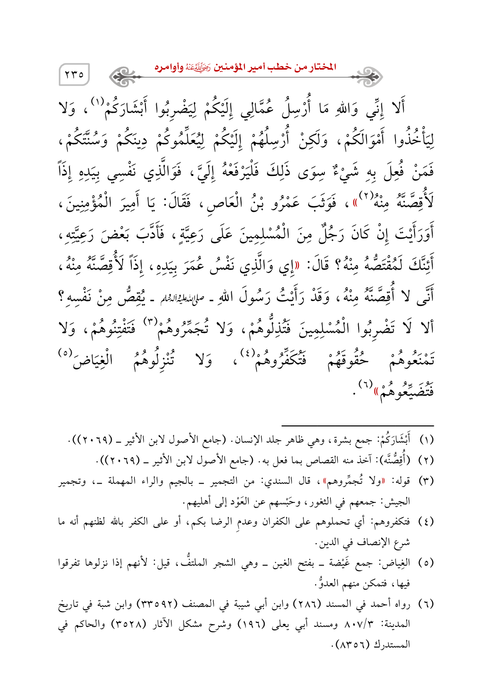 أَلا إِنِّي وَاللهِ مَا أُرْسِلُ عُمَّالِي إِلَيْكُمْ لِيَضْرِبُوا أَبْشَارَكُمْ (¬1)، وَلا لِيَاخُذُوا أَمْوَالَكُمْ، وَلَكِنْ أُرْسِلُهُمْ إِلَيْكُمْ لِيُعَلِّمُوكُمْ دِينَكُمْ وَسُنَّتَكُمْ، فَمَنْ فُعِلَ بِهِ شَيْءٌ سِوَى ذَلِكَ فَلْيَرْفَعْهُ إِلَيَّ، فَوَالَّذِي نَفْسِي بِيَدِهِ إِذَاً لَأُقِصَّنَّهُ مِنْهُ (¬2)))، فَوَثَبَ عَمْرُو بْنُ الْعَاصِ، فَقَالَ: يَا أَمِيرَ الْمُؤْمِنِينَ، أَوَرَأَيْتَ إِنْ كَانَ رَجُلٌ مِنَ الْمُسْلِمِينَ عَلَى رَعِيَّةٍ، فَأَدَّبَ بَعْضَ رَعِيَّتِهِ، أَئِنَّكَ لَمُقْتَصُّهُ مِنْهُ؟ قَالَ: ((إِي وَالَّذِي نَفْسُ عُمَرَ بِيَدِهِ، إِذَاً لَأُقِصَّنَّهُ مِنْهُ، أَنَّى لا أُقِصَّنَّهُ مِنْهُ، وَقَدْ رَأَيْتُ رَسُولَ اللهِ - صَلَّى اللَّهُ عَلَيْهِ وَسَلَّمَ - يُقِصُّ مِنْ نَفْسِهِ؟ ألا لَا تَضْرِبُوا الْمُسْلِمِينَ فَتُذِلُّوهُمْ، وَلا تُجَمِّرُوهُمْ (¬3) فَتَفْتِنُوهُمْ، وَلا تَمْنَعُوهُمْ حُقُوقَهُمْ فَتُكَفِّرُوهُمْ (¬4)، وَلا تُنْزِلُوهُمُ الْغِيَاضَ (¬5)