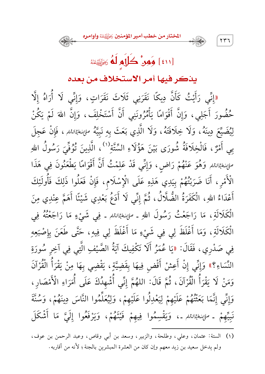 (¬1) الستة: عثمان، وعلي، وطلحة، والزبير، وسعد بن أبي وقاص، وعبد الرحمن بن عوف، ولم يدخل سعيد بن زيد معهم وإن كان من العشرة المبشرين بالجنة؛ لأنه من أقاربه ..
