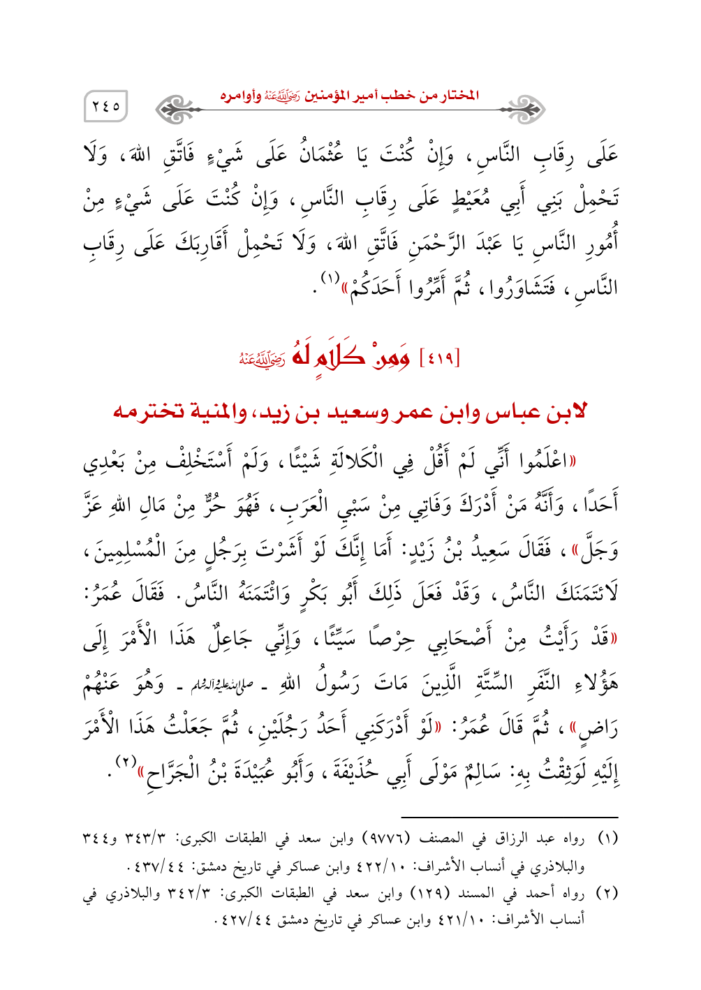(¬2) رواه أحمد في المسند (129) وابن سعد في الطبقات الكبرى: 3/ 342 والبلاذري في أنساب الأشراف: 10/ 421 وابن عساكر في تاريخ دمشق 44/ 427.
