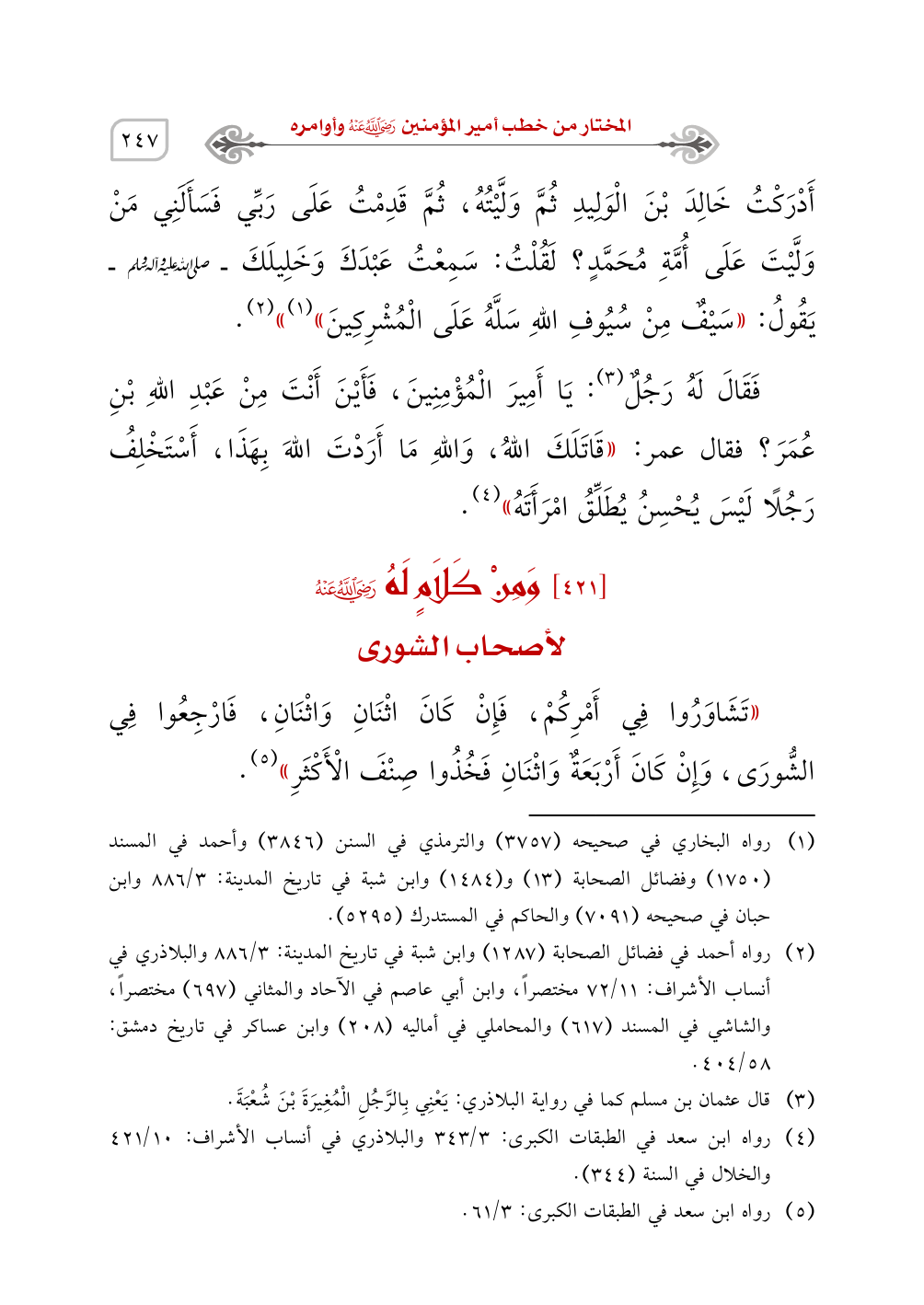(¬4) رواه ابن سعد في الطبقات الكبرى: 3/ 343 والبلاذري في أنساب الأشراف: 10/ 421 والخلال في السنة (344).