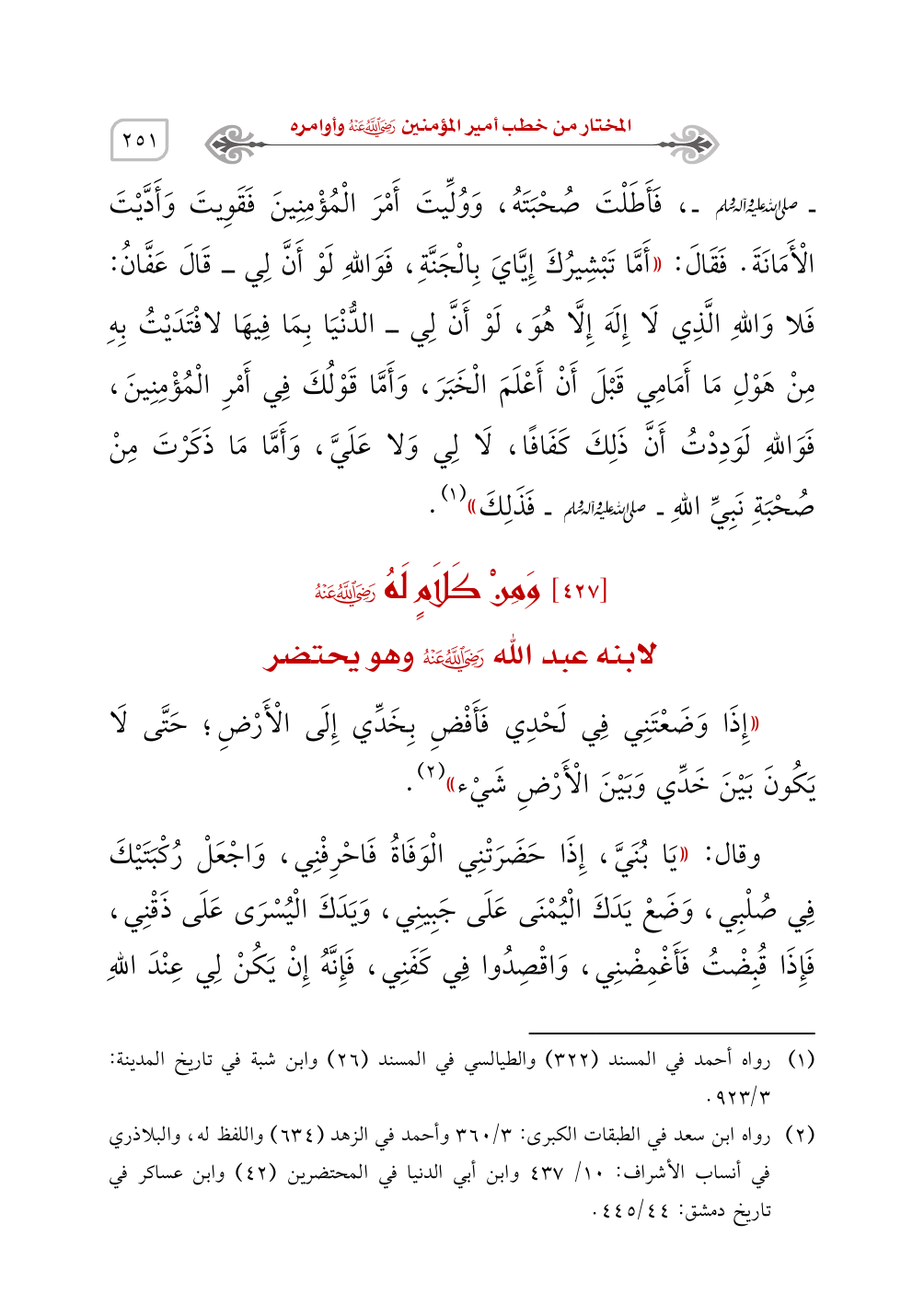 (¬2) رواه ابن سعد في الطبقات الكبرى: 3/ 360 وأحمد في الزهد (634) واللفظ له، والبلاذري في أنساب الأشراف: 10/ 437 وابن أبي الدنيا في المحتضرين (42) وابن عساكر في تاريخ دمشق: 44/ 445.