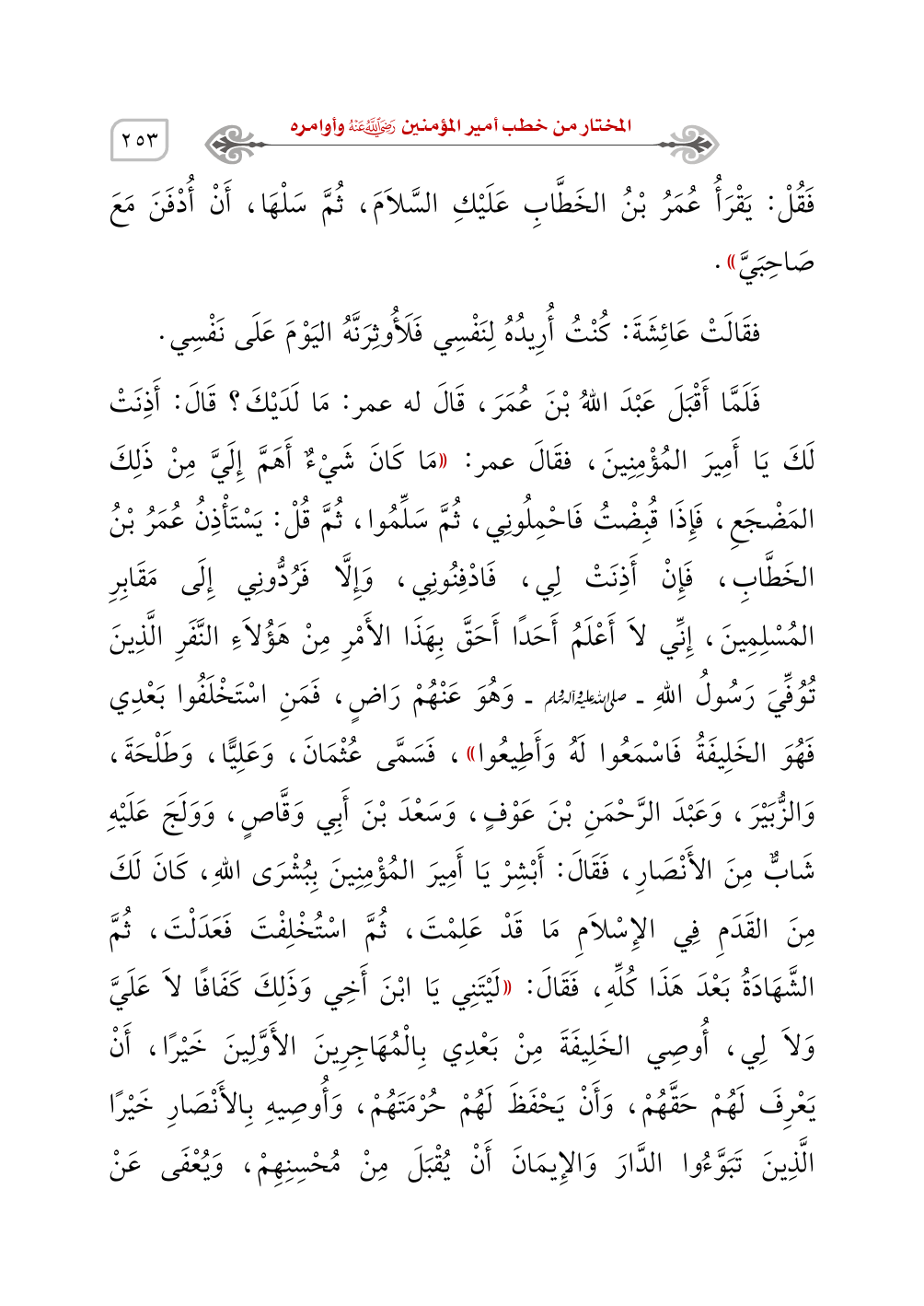 فَلَمَّا أَقْبَلَ عَبْدَ اللهُ بْنَ عُمَرَ، قَالَ له عمر: مَا لَدَيْكَ؟ قَالَ: أَذِنَتْ لَكَ يَا أَمِيرَ المُؤْمِنِينَ، فقَالَ عمر: ((مَا كَانَ شَيْءٌ أَهَمَّ إِلَيَّ مِنْ ذَلِكَ المَضْجَعِ، فَإِذَا قُبِضْتُ فَاحْمِلُونِي، ثُمَّ سَلِّمُوا، ثُمَّ قُلْ: يَسْتَاذِنُ عُمَرُ بْنُ الخَطَّابِ، فَإِنْ أَذِنَتْ لِي، فَادْفِنُونِي، وَإِلَّا فَرُدُّونِي إِلَى مَقَابِرِ المُسْلِمِينَ، إِنِّي لاَ أَعْلَمُ أَحَدًا أَحَقَّ بِهَذَا الأَمْرِ مِنْ هَؤُلاَءِ النَّفَرِ الَّذِينَ تُوُفِّيَ رَسُولُ اللهِ - صَلَّى اللَّهُ عَلَيْهِ وَسَلَّمَ - وَهُوَ عَنْهُمْ رَاضٍ، فَمَنِ اسْتَخْلَفُوا بَعْدِي فَهُوَ الخَلِيفَةُ فَاسْمَعُوا لَهُ وَأَطِيعُوا))، فَسَمَّى عُثْمَانَ، وَعَلِيًّا، وَطَلْحَةَ، وَالزُّبَيْرَ، وَعَبْدَ الرَّحْمَنِ بْنَ عَوْفٍ، وَسَعْدَ بْنَ أَبِي وَقَّاصٍ، وَوَلَجَ عَلَيْهِ شَابٌّ مِنَ الأَنْصَارِ، فَقَالَ: أَبْشِرْ يَا أَمِيرَ المُؤْمِنِينَ بِبُشْرَى اللهِ، كَانَ لَكَ مِنَ القَدَمِ فِي الإِسْلاَمِ مَا قَدْ عَلِمْتَ، ثُمَّ اسْتُخْلِفْتَ فَعَدَلْتَ، ثُمَّ الشَّهَادَةُ بَعْدَ هَذَا كُلِّهِ، فَقَالَ: ((لَيْتَنِي يَا ابْنَ أَخِي وَذَلِكَ كَفَافًا لاَ عَلَيَّ وَلاَ لِي، أُوصِي الخَلِيفَةَ مِنْ بَعْدِي بِالْمُهَاجِرِينَ الأَوَّلِينَ خَيْرًا، أَنْ يَعْرِفَ لَهُمْ حَقَّهُمْ، وَأَنْ يَحْفَظَ لَهُمْ حُرْمَتَهُمْ، وَأُوصِيهِ بِالأَنْصَارِ خَيْرًا الَّذِينَ تَبَوَّءُوا الدَّارَ وَالإِيمَانَ أَنْ يُقْبَلَ مِنْ مُحْسِنِهِمْ، وَيُعْفَى عَنْ