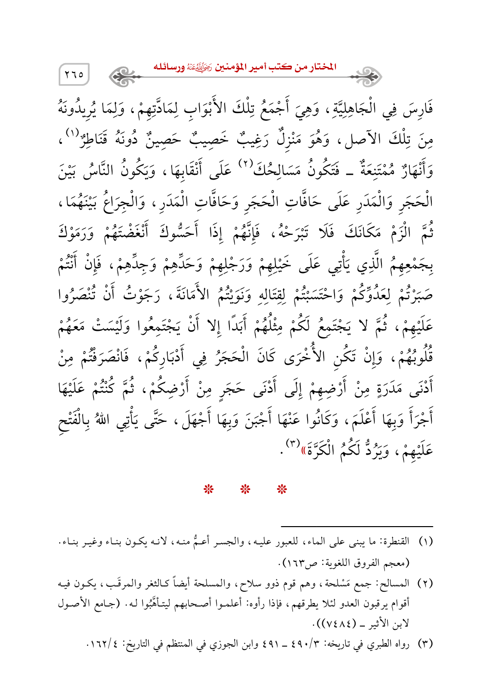 فَارِسَ فِي الْجَاهِلِيَّةِ، وَهِيَ أَجْمَعُ تِلْكَ الأَبْوَابِ لِمَادَّتِهِمْ، وَلِمَا يُرِيدُونَهُ مِنَ تِلْكَ الآصل، وَهُوَ مَنْزِلٌ رَغِيبٌ خَصِيبٌ حَصِينٌ دُونَهُ قَنَاطِرٌ (¬1)، وَأَنْهَارٌ مُمْتَنِعَةٌ - فَتَكُونُ مَسَالِحُكَ (¬2)