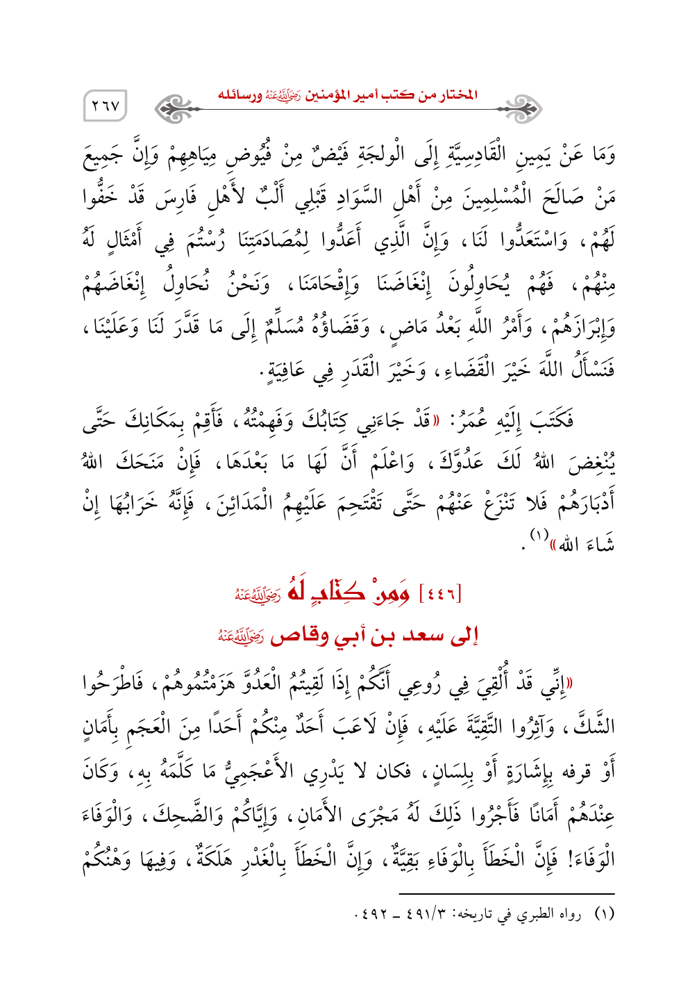 وَمَا عَنْ يَمِينِ الْقَادِسِيَّةِ إِلَى الْولجَةِ فَيْضٌ مِنْ فُيُوضِ مِيَاهِهِمْ وَإِنَّ جَمِيعَ مَنْ صَالَحَ الْمُسْلِمِينَ مِنْ أَهْلِ السَّوَادِ قَبْلِي أَلْبٌ لأَهْلِ فَارِسَ قَدْ خَفُّوا لَهُمْ، وَاسْتَعَدُّوا لَنَا، وَإِنَّ الَّذِي أَعَدُّوا لِمُصَادَمَتِنَا رُسْتُمَ فِي أَمْثَالٍ لَهُ مِنْهُمْ، فَهُمْ يُحَاوِلُونَ إِنْغَاضَنَا وَإِقْحَامَنَا، وَنَحْنُ نُحَاوِلُ إِنْغَاضَهُمْ وَإِبْرَازَهُمْ، وَأَمْرُ اللَّهِ بَعْدُ مَاضٍ، وَقَضَاؤُهُ مُسَلِّمٌ إِلَى مَا قَدَّرَ لَنَا وَعَلَيْنَا، فَنَسْأَلُ اللَّهَ خَيْرَ الْقَضَاءِ، وَخَيْرَ الْقَدَرِ فِي عَافِيَةٍ.