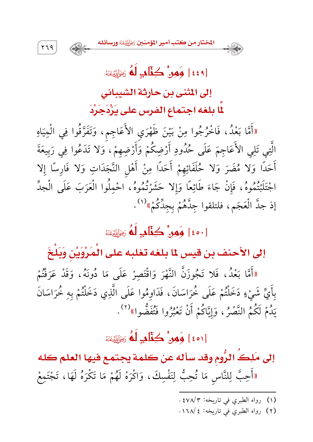 ((أَمَّا بَعْدُ، فَاخْرُجُوا مِنْ بَيْنَ ظَهْرَيِ الأَعَاجِمِ، وَتَفَرَّقُوا فِي الْمِيَاهِ الَّتِي تَلِي الأَعَاجِمَ عَلَى حُدُودِ أَرْضِكُمْ وَأَرْضِهِمْ، وَلا تَدَعُوا فِي رَبِيعَةَ أَحَدًا وَلا مُضَرَ وَلا حُلَفَائِهِمْ أَحَدًا مِنْ أَهْلِ النَّجَدَاتِ وَلا فَارِسًا إِلا اجْتَلَبْتُمُوهُ، فَإِنْ جَاءَ طَائِعًا وَإِلا حَشَرْتُمُوهُ، احْمِلُوا الْعَرَبَ عَلَى الْجدِّ إذ جدَّ الْعَجَم، فلتلقوا جِدَّهُمْ بِجِدِّكُمْ)) (¬1).