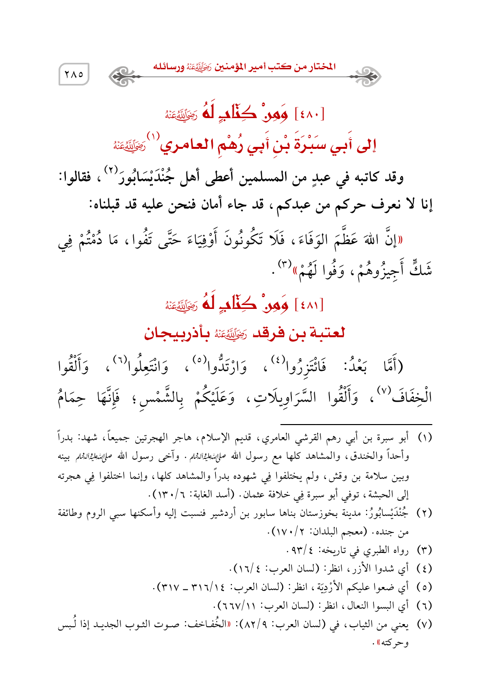 وقد كاتبه في عبدٍ من المسلمين أعطى أهل جُنْدَيْسَابُورَ (¬2)، فقالوا: إنا لا نعرف حركم من عبدكم، قد جاء أمان فنحن عليه قد قبلناه: