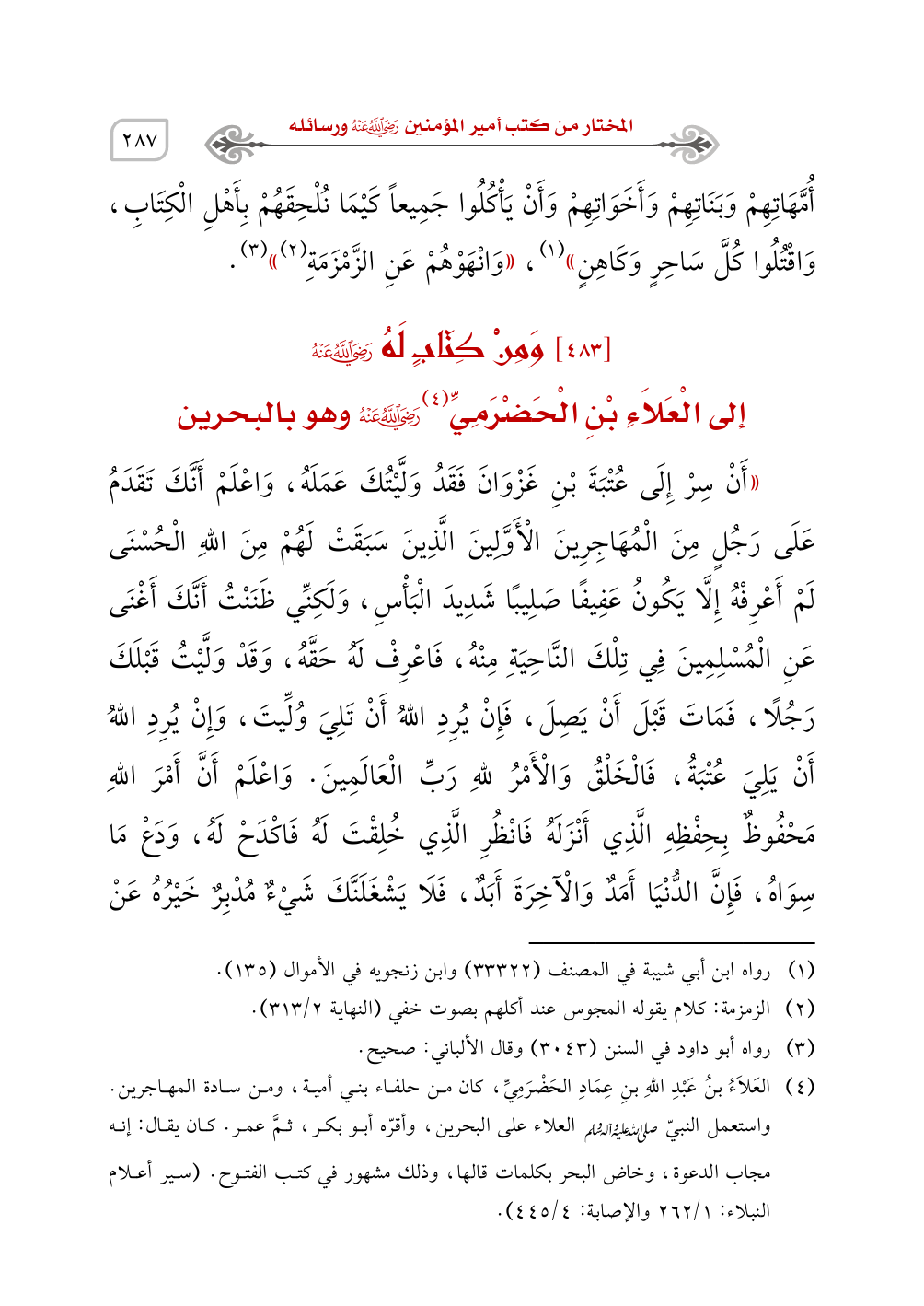 ((أَنْ سِرْ إِلَى عُتْبَةَ بْنِ غَزْوَانَ فَقَدُ وَلَّيْتُكَ عَمَلَهُ، وَاعْلَمْ أَنَّكَ تَقَدَمُ عَلَى رَجُلٍ مِنَ الْمُهَاجِرِينَ الْأَوَّلِينَ الَّذِينَ سَبَقَتْ لَهُمْ مِنَ اللهِ الْحُسْنَى لَمْ أَعْرِفْهُ إِلَّا يَكُونُ عَفِيفًا صَلِيبًا شَدِيدَ الْبَاسِ، وَلَكِنِّي ظَنَنْتُ أَنَّكَ أَغْنَى عَنِ الْمُسْلِمِينَ فِي تِلْكَ النَّاحِيَةِ مِنْهُ، فَاعْرِفْ لَهُ حَقَّهُ، وَقَدْ وَلَّيْتُ قَبْلَكَ رَجُلًا، فَمَاتَ قَبْلَ أَنْ يَصِلَ، فَإِنْ يُرِدِ اللهُ أَنْ تَلِيَ وُلِّيتَ، وَإِنْ يُرِدِ اللهُ أَنْ يَلِيَ عُتْبَةُ، فَالْخَلْقُ وَالْأَمْرُ للهِ رَبِّ الْعَالَمِينَ. وَاعْلَمْ أَنَّ أَمْرَ اللهِ مَحْفُوظٌ بِحِفْظِهِ الَّذِي أَنْزَلَهُ فَانْظُرِ الَّذِي خُلِقْتَ لَهُ فَاكْدَحْ لَهُ، وَدَعْ مَا سِوَاهُ، فَإِنَّ الدُّنْيَا أَمَدٌ وَالْآخِرَةَ أَبَدٌ، فَلَا يَشْغَلَنَّكَ شَيْءٌ مُدْبِرٌ خَيْرُهُ عَنْ