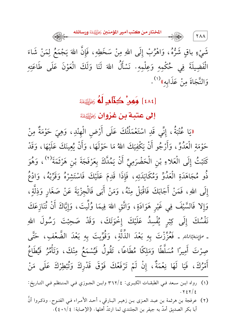 ((يَا عُتْبَةُ، إِنِّي قَدِ اسْتَعْمَلْتُكَ عَلَى أَرْضِ الْهِنْدِ، وَهِيَ حَوْمَةٌ مِنْ حَوْمَةِ الْعَدُوِّ، وَأَرْجُو أَنْ يَكْفِيَكَ اللهُ مَا حَوْلَهَا، وَأَنْ يُعِينَكَ عَلَيْهَا، وَقَدْ كَتَبْتُ إِلَى الْعَلاءِ بْنِ الْحَضْرَمِيِّ أَنْ يَمُدَّكَ بِعَرْفَجَةَ بْنِ هَرْثَمَةَ (¬2)، وَهُوَ ذُو مُجَاهَدَةِ الْعَدُوِّ وَمُكَايَدَتِهِ، فَإِذَا قَدِمَ عَلَيْكَ فَاسْتَشِرْهُ وَقَرِّبْهُ، وَادْعُ إِلَى اللهِ، فَمَنْ أَجَابَكَ فَاقْبَلْ مِنْهُ، وَمَنْ أَبَى فَالْجِزْيَةَ عَنْ صَغَارٍ وَذِلَّةٍ، وَإِلا فَالسَّيْفَ فِي غَيْرِ هَوَادَةٍ، وَاتَّقِ اللهَ فِيمَا وُلِّيتَ، وَإِيَّاكَ أَنْ تُنَازِعَكَ نَفْسُكَ إِلَى كِبْرٍ يُفْسِدُ عَلَيْكَ إِخْوَتَكَ، وَقَدْ صَحِبْتَ رَسُولَ اللهِ - صَلَّى اللَّهُ عَلَيْهِ وَسَلَّمَ - فَعُزِّزْتَ بِهِ بَعْدَ الذِّلَّةِ، وَقُوِّيتَ بِهِ بَعْدَ الضَّعْفِ، حَتَّى صِرْتَ أَمِيرًا مُسَلَّطًا وَمَلِكًا مُطَاعًا، تَقُولُ فَيُسْمَعُ مِنْكَ، وَتَامُرُ فَيُطَاعُ أَمْرُكَ، فَيَا لَهَا نِعْمَةٌ، إِنْ لَمْ تَرْفَعْكَ فَوْقَ قَدْرِكَ وَتُبْطِرْكَ عَلَى مَنْ