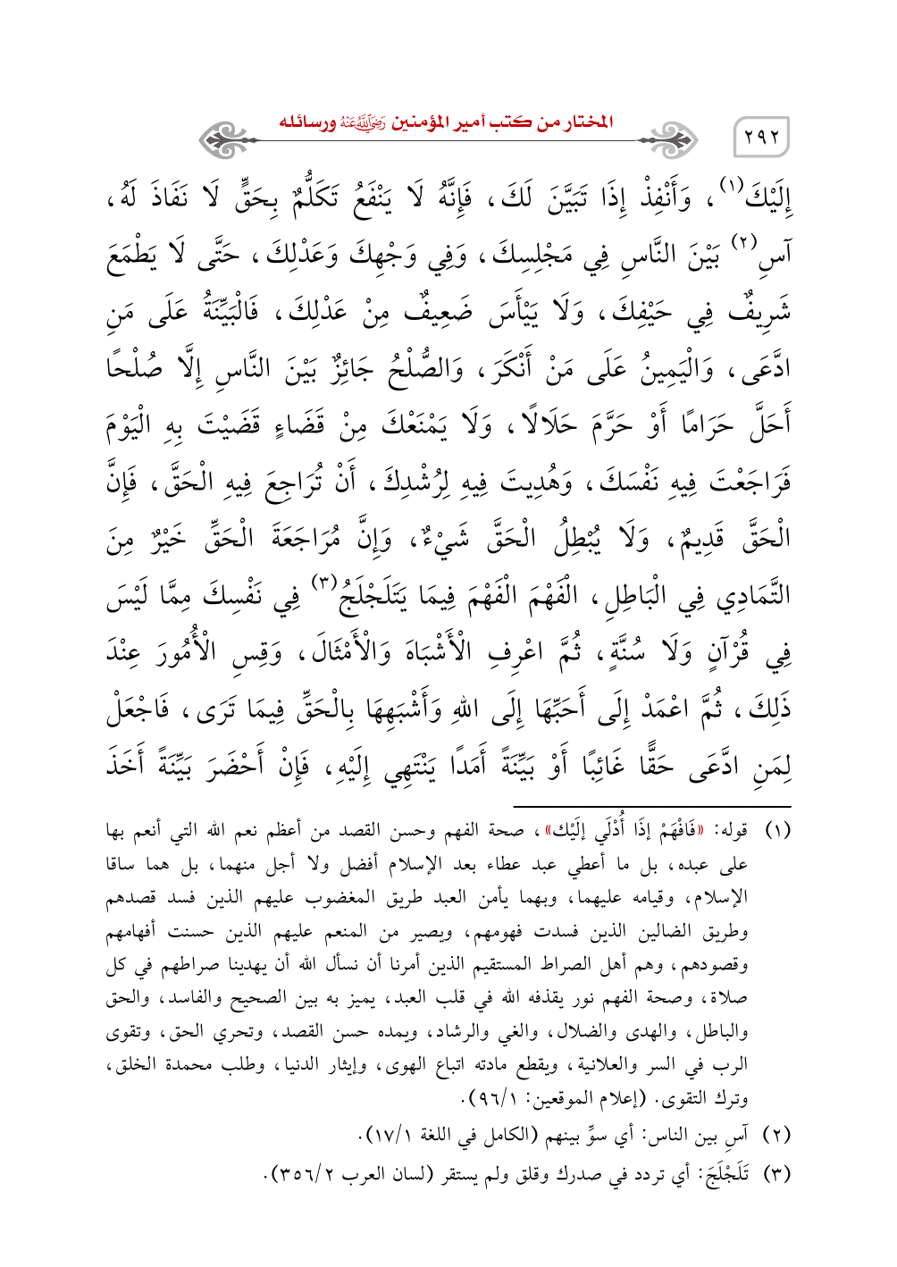 بَيْنَ النَّاسِ فِي مَجْلِسِكَ، وَفِي وَجْهِكَ وَعَدْلِكَ، حَتَّى لَا يَطْمَعَ شَرِيفٌ فِي حَيْفِكَ، وَلَا يَيْأَسَ ضَعِيفٌ مِنْ عَدْلِكَ، فَالْبَيِّنَةُ عَلَى مَنِ ادَّعَى، وَالْيَمِينُ عَلَى مَنْ أَنْكَرَ، وَالصُّلْحُ جَائِزٌ بَيْنَ النَّاسِ إِلَّا صُلْحًا أَحَلَّ حَرَامًا أَوْ حَرَّمَ حَلَالًا، وَلَا يَمْنَعْكَ مِنْ قَضَاءٍ قَضَيْتَ بِهِ الْيَوْمَ فَرَاجَعْتَ فِيهِ نَفْسَكَ، وَهُدِيتَ فِيهِ لِرُشْدِكَ، أَنْ تُرَاجِعَ فِيهِ الْحَقَّ، فَإِنَّ الْحَقَّ قَدِيمٌ، وَلَا يُبْطِلُ الْحَقَّ شَيْءٌ، وَإِنَّ مُرَاجَعَةَ الْحَقِّ خَيْرٌ مِنَ التَّمَادِي فِي الْبَاطِلِ، الْفَهْمَ الْفَهْمَ فِيمَا يَتَلَجْلَجُ (¬3) فِي نَفْسِكَ مِمَّا لَيْسَ فِي قُرْآنٍ وَلَا سُنَّةٍ، ثُمَّ اعْرِفِ الْأَشْبَاهَ وَالْأَمْثَالَ، وَقِسِ الْأُمُورَ عِنْدَ ذَلِكَ، ثُمَّ اعْمَدْ إِلَى أَحَبِّهَا إِلَى اللهِ وَأَشْبَهِهَا بِالْحَقِّ فِيمَا تَرَى، فَاجْعَلْ لِمَنِ ادَّعَى حَقًّا غَائِبًا أَوْ بَيِّنَةً أَمَدًا يَنْتَهِي إِلَيْهِ، فَإِنْ أَحْضَرَ بَيِّنَةً أَخَذَ