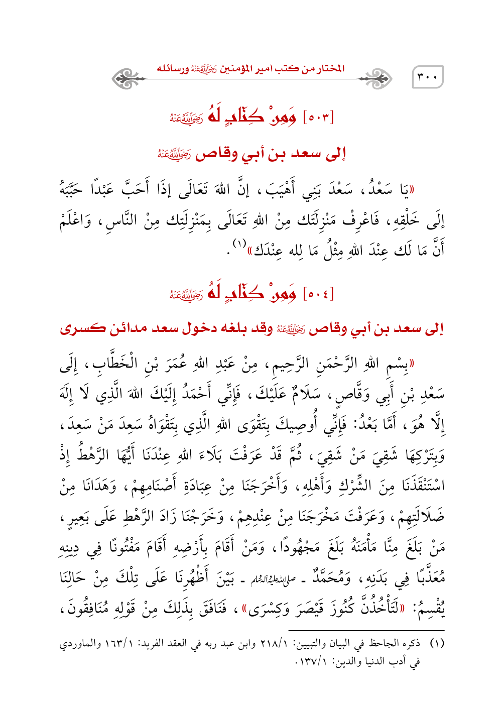 ((بِسْمِ اللهِ الرَّحْمَنِ الرَّحِيمِ، مِنْ عَبْدِ اللهِ عُمَرَ بْنِ الْخَطَّابِ، إِلَى سَعْدِ بْنِ أَبِي وَقَّاصٍ، سَلَامٌ عَلَيْكَ، فَإِنِّي أَحْمَدُ إِلَيْكَ اللهَ الَّذِي لَا إِلَهَ إِلَّا هُوَ، أَمَّا بَعْدُ: فَإِنِّي أُوصِيكَ بِتَقْوَى اللهِ الَّذِي بِتَقْوَاهُ سَعِدَ مَنْ سَعِدَ، وَبِتَرْكِهَا شَقِيَ مَنْ شَقِيَ، ثُمَّ قَدْ عَرَفْتَ بَلَاءَ اللهِ عِنْدَنَا أَيُّهَا الرَّهْطُ إِذْ اسْتَنْقَذَنَا مِنَ الشِّرْكِ وَأَهْلِهِ، وَأَخْرَجَنَا مِنْ عِبَادَةِ أَصْنَامِهِمْ، وَهَدَانَا مِنْ ضَلَالَتِهِمْ، وَعَرَفْتَ مَخْرَجَنَا مِنْ عِنْدِهِمْ، وَخَرَجْنَا زَادَ الرَّهْطِ عَلَى بَعِيرٍ، مَنْ بَلَغَ مِنَّا مَامَنَهُ بَلَغَ مَجْهُودًا، وَمَنْ أَقَامَ بِأَرْضِهِ أَقَامَ مَفْتُونًا فِي دِينِهِ مُعَذَّبًا فِي بَدَنِهِ، وَمُحَمَّدٌ - صَلَّى اللَّهُ عَلَيْهِ وَسَلَّمَ - بَيْنَ أَظْهُرِنَا عَلَى تِلْكَ مِنْ حَالِنَا يُقْسِمُ: ((لَتَاخُذُنَّ كُنُوزَ قَيْصَرَ وَكِسْرَى))، فَنَافَقَ بِذَلِكَ مِنْ قَوْلِهِ مُنَافِقُونَ،
